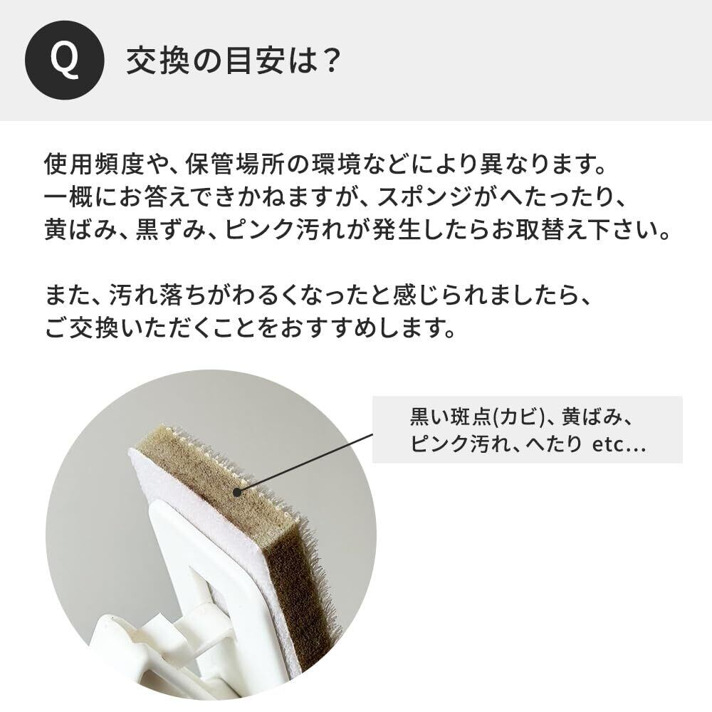 【スペア交換】 スポンジの取り付けは、面ファスナー式で簡単です。スポンジの白色の面とグリップの裏側が貼り付きます。ブラシが劣化した場合は、セットのスペア「sm@rt-SQA88浴室床洗いスペア」と交換できます。※浴室床洗い本体についているブラシとスペアを合わせて清掃部分ブラシスポンジは計3個ついています。
