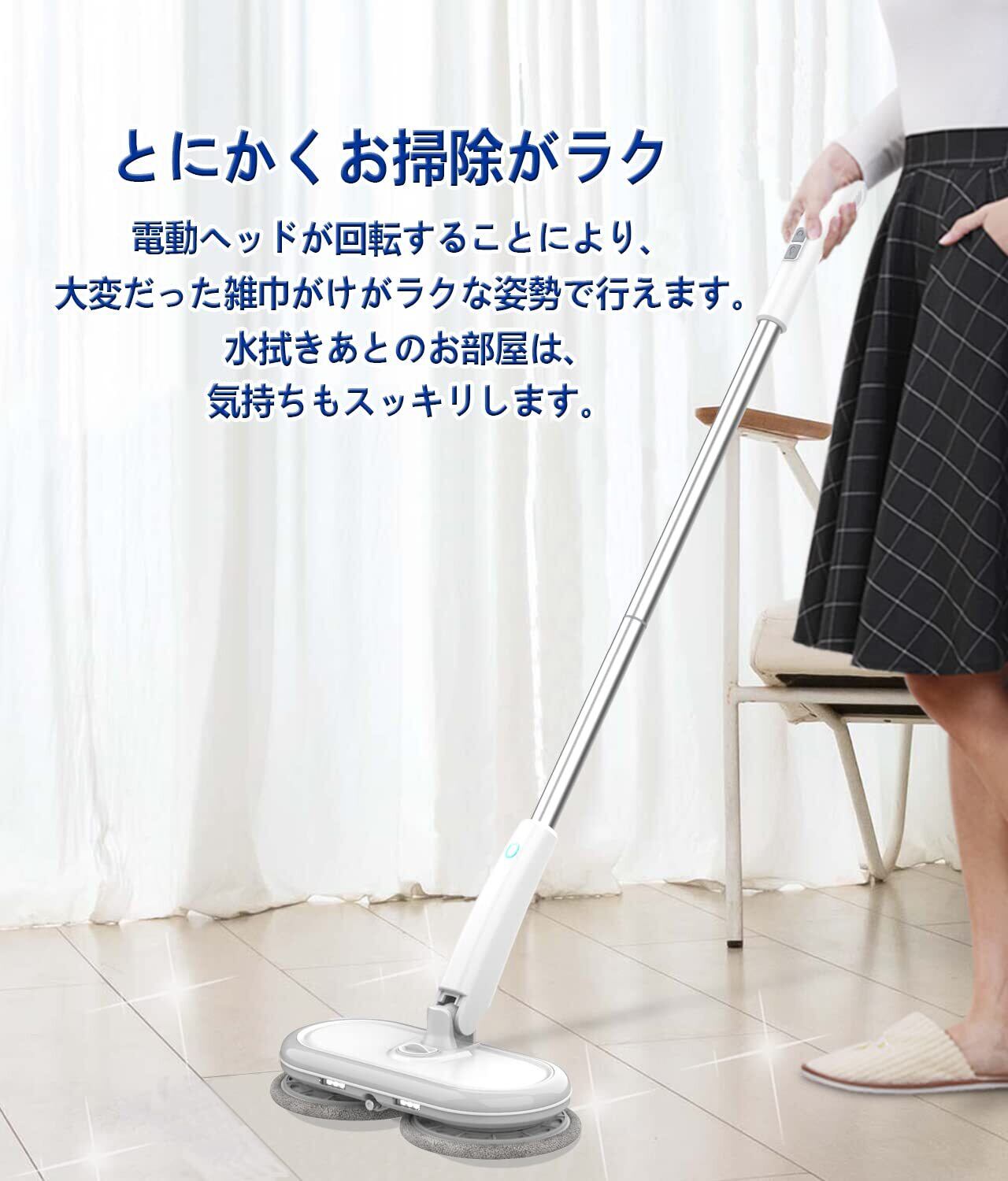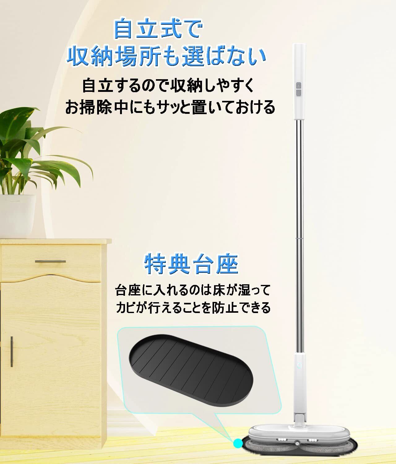 【高い操作性でラクラクお掃除】回転モップのヘッドの角度が自由自在に動かせます。汚れの溜まりやすいお部屋の隅もしっかりキレイに。充電式なのでコードレス操作ができるため、コードに邪魔されず、どこでも自由に掃除ができます 。自立するから収納しやすく、お掃除中もサッと置いておける。また、回転モップ用台座を付属されて、湿っていたモップパッドを床に直接接触するのを避けて、カビが生えるのを防止することができます。