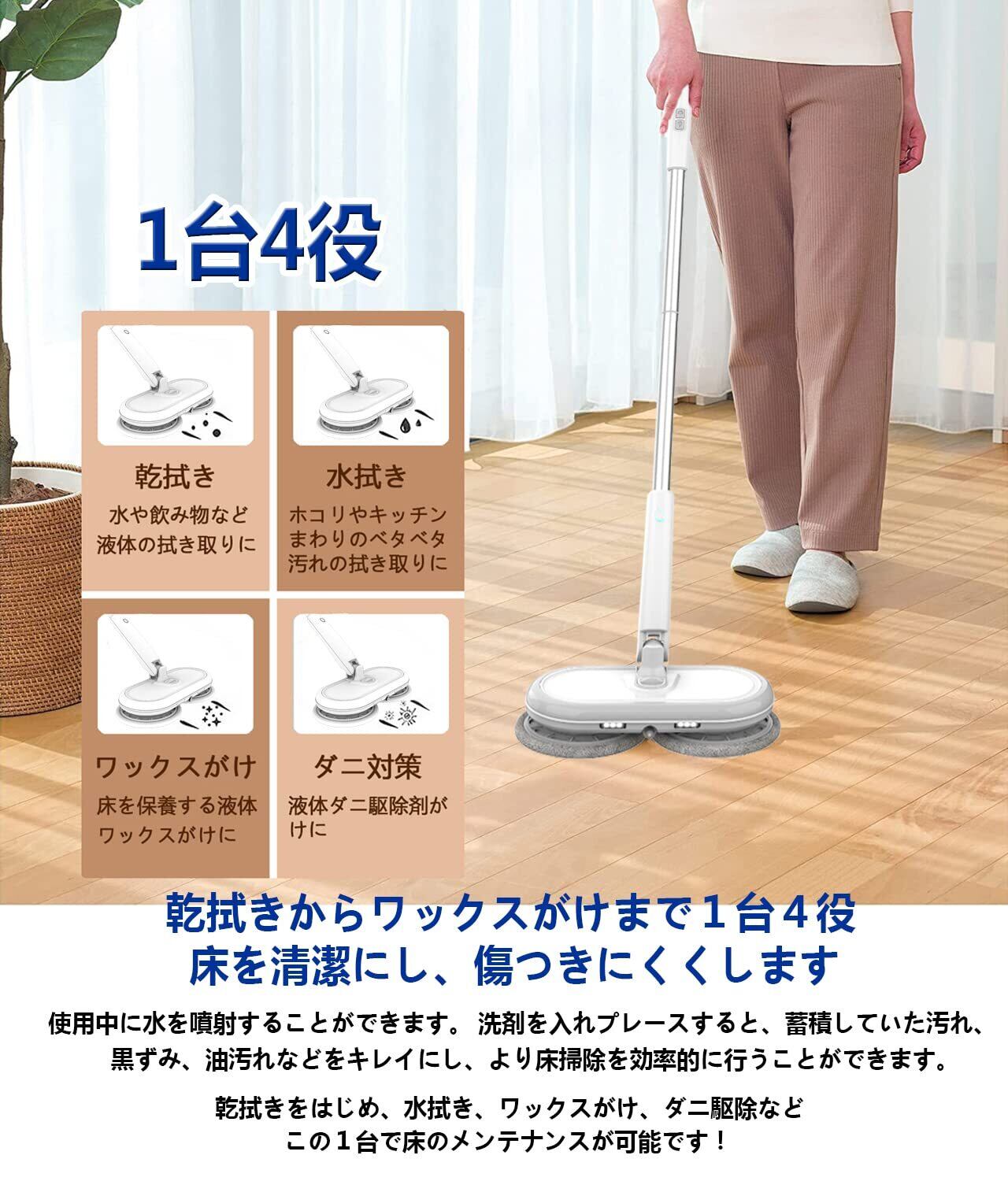 GOBOT 電動モップ コードレス回転モップクリーナー 軽量化 回転モップ 1台4役 水噴射 モップクリーナー 200回/分 替えモップ6枚付き 拭き掃除 充電式 水拭き フローリング 掃除 コードレスクリーナー フローリング 掃除 床掃除 自立式 掃除グッズ (ホワイト)