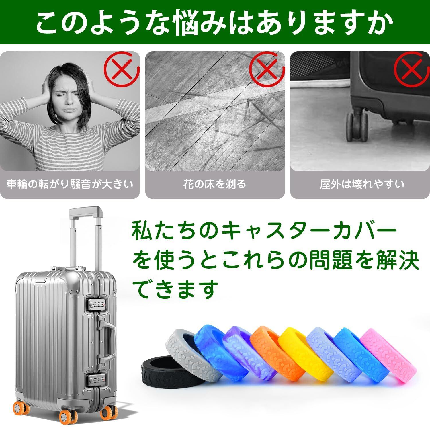 【簡単な取り付けと洗浄】ホイールを外さなくても取り付けることができ、数秒で取り付けが完了します。使用後、丁寧に水洗いし、陰干しすれば使い続けます。また、キャスターを室外に使用した后、カバーを取り除くことで、スーツケースの汚れを室内持ち込まないようにできます。さまざまな色の選択肢があり、スー茨ケースの個性化と美観を高めることができま