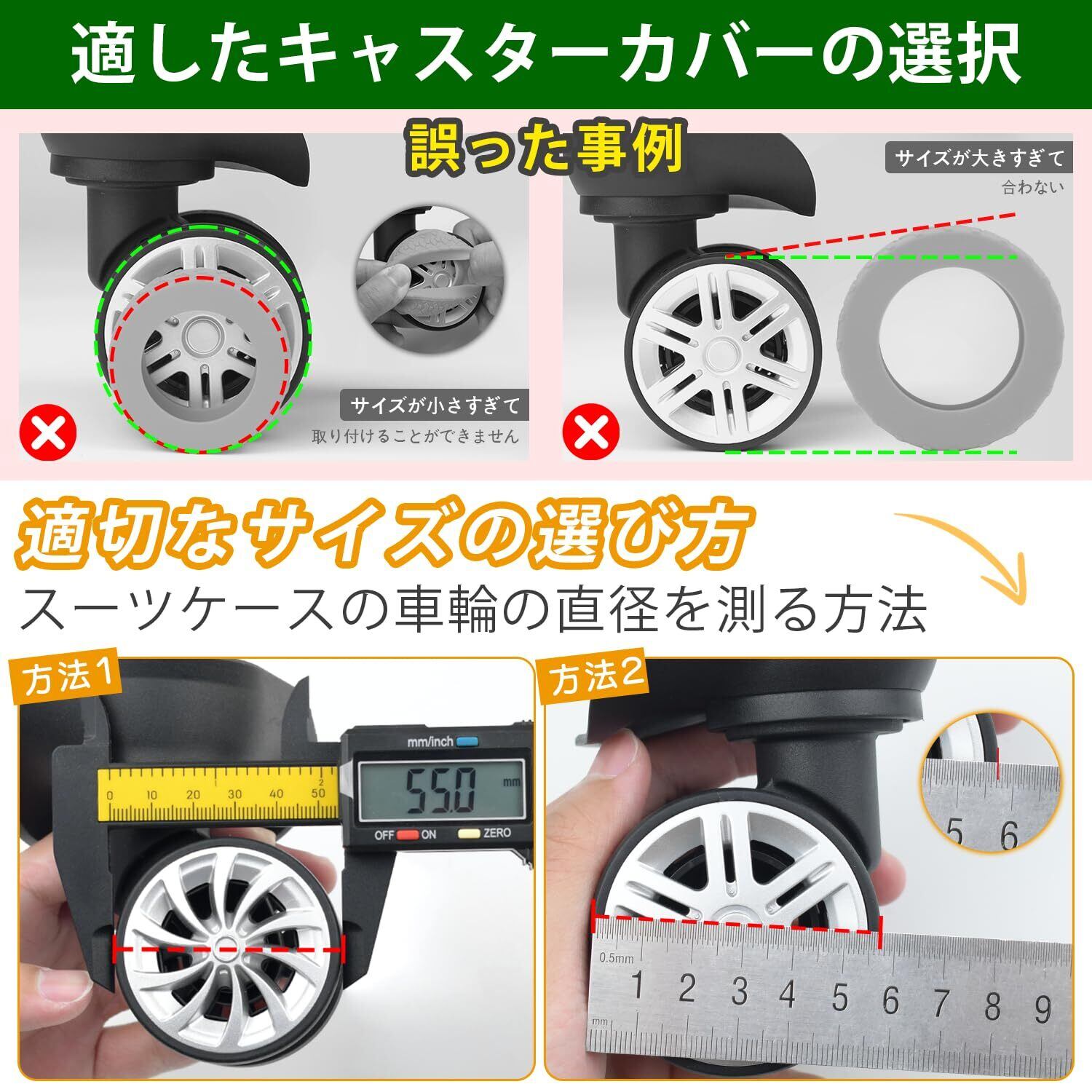 【購入・使用時の注意点】ご購入前に定規でスーツケースの車輪の直径を測定し、ホイールとフェンダーの間隔が4mm以上、ホイールと車軸の間隔が3mm以上であることを確認してください。測定結果に基づき、車輪サイズに合ったローラーカバーを選択し、最適な旅行体験をお楽しみください。本製品はダブルホイール仕様のスーツケース専用で、シングルホイールデザインには使用できません