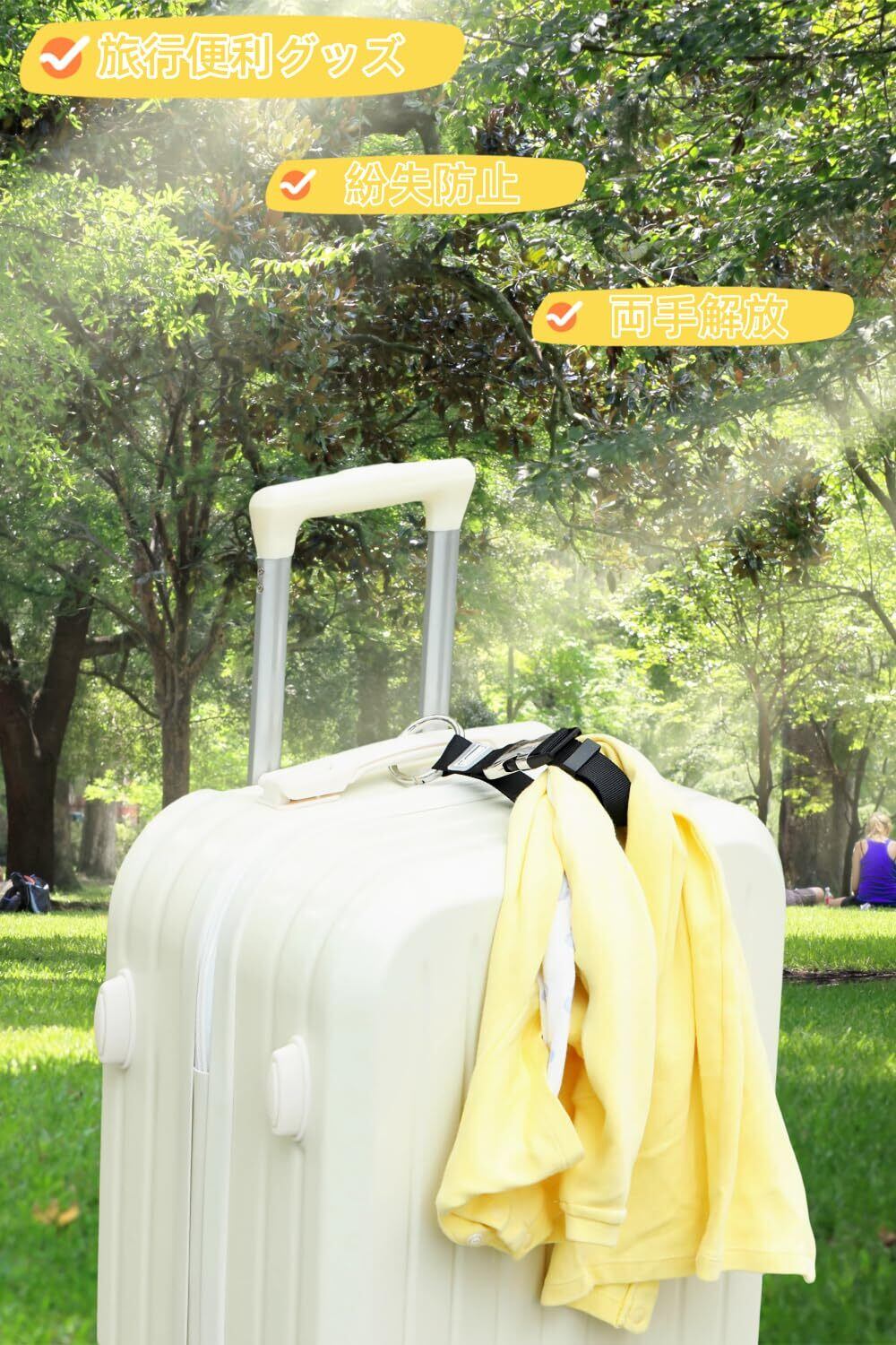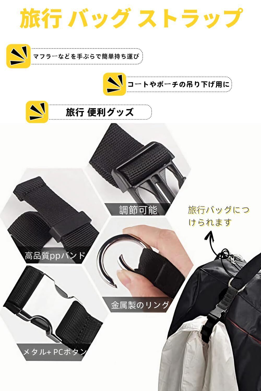【幅広い用途】このベルトは、トロリーケースに荷物を取り付けることができ、旅行やビジネスの際によりリラックスした時間をお過ごしいただけます。ハンドバッグ、荷物、ブリーフケース、カートなど、さまざまなバッグに対応しており、出張や旅行、季節の変わり目に重宝すること間違いありません。また、このベルトは両手を解放することができますので、ジャケットやマフラーなどを簡単にバッグやスーツケースに取り付けて持ち運ぶことが