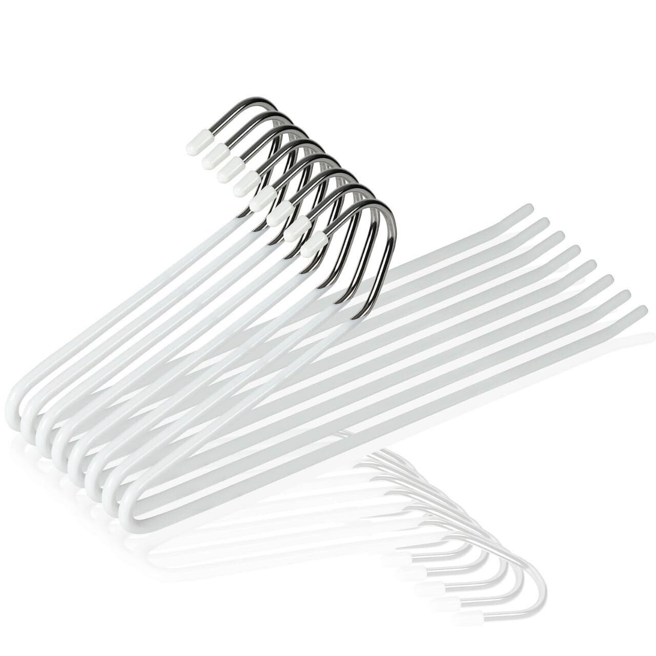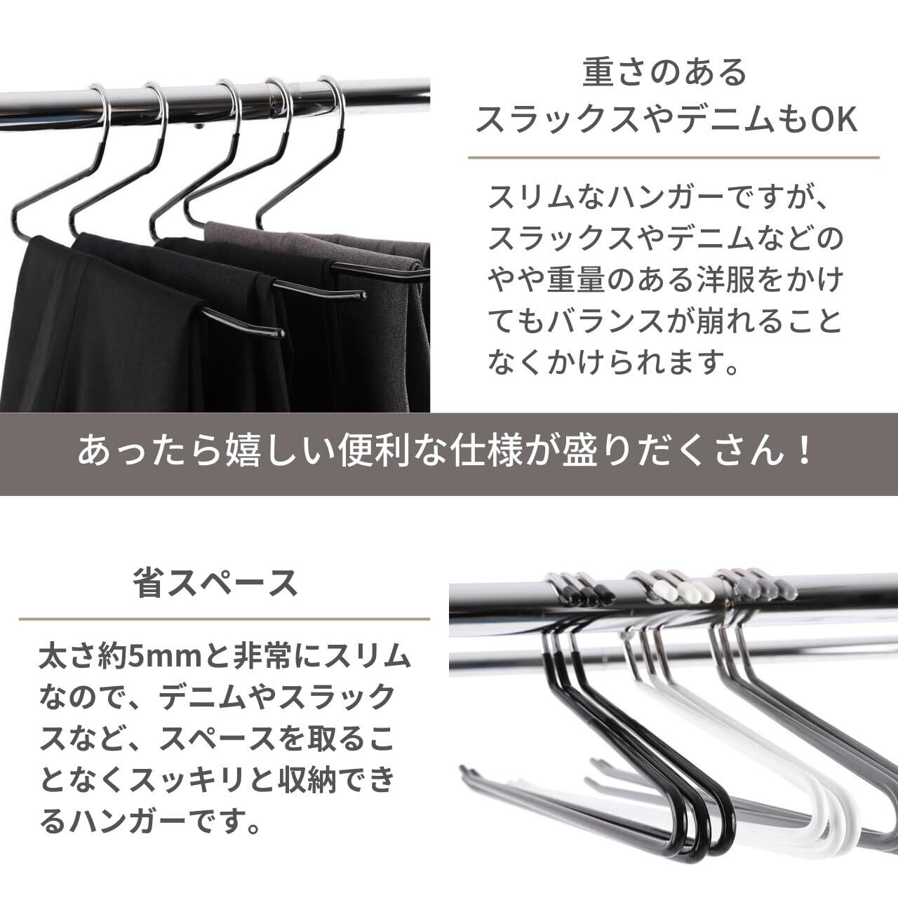 【優れた耐久性】ハンガー本体は頑丈なスチール素材に錆や傷に強いメッキ加工を施しているので耐久性に優れています。太さ約5mm、1本あたり80g弱と細くて軽いのですが、冬用の長いストールをかけたり、重いジーンズをかけても、落ちず、変形せず、すっきりと片付きます。また、乾湿両用ですので、洗濯後に濡れた状態のスラックスをかけても安心です、色移りを気にせず洗濯ハンガーとして使用でき、屋内外で使用できます。
