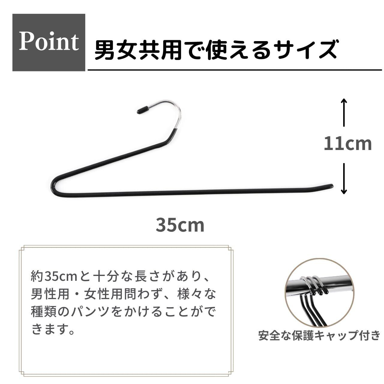 【省スペース】35cm(長さ)*11cm(高さ)*0.5cm(幅)のサイズで、標準的なクローゼットのレールにフィットするようにフックは作られております。ハンガーは太さ約5mmと非常にスリムなので、デニムやスラックスなど、スペースを取ることなくスッキリと収納できるハンガーです。長さも約35cmと十分な長さがあり、男性用・女性用問わず、様々な種類のパンツをかけることができます。