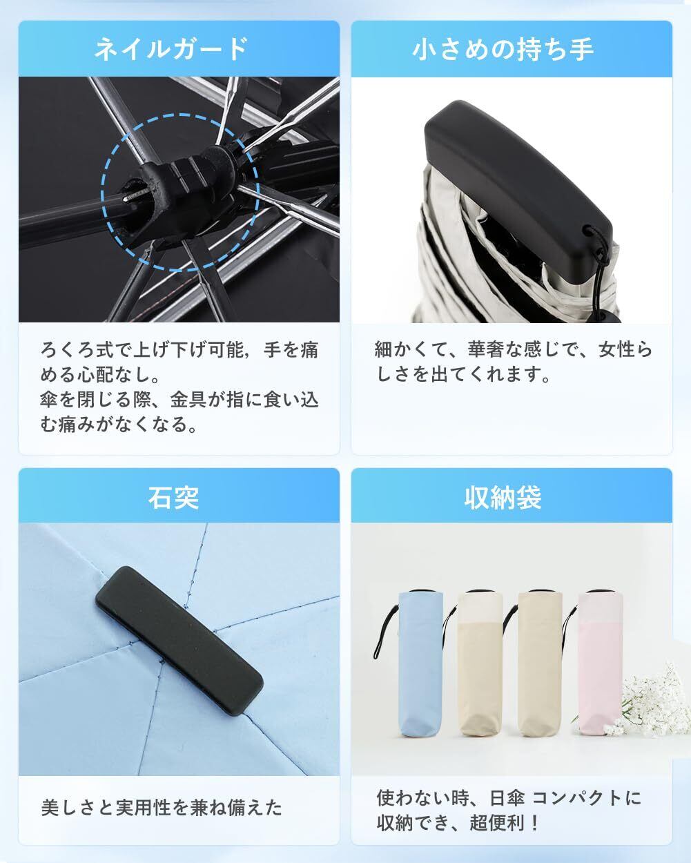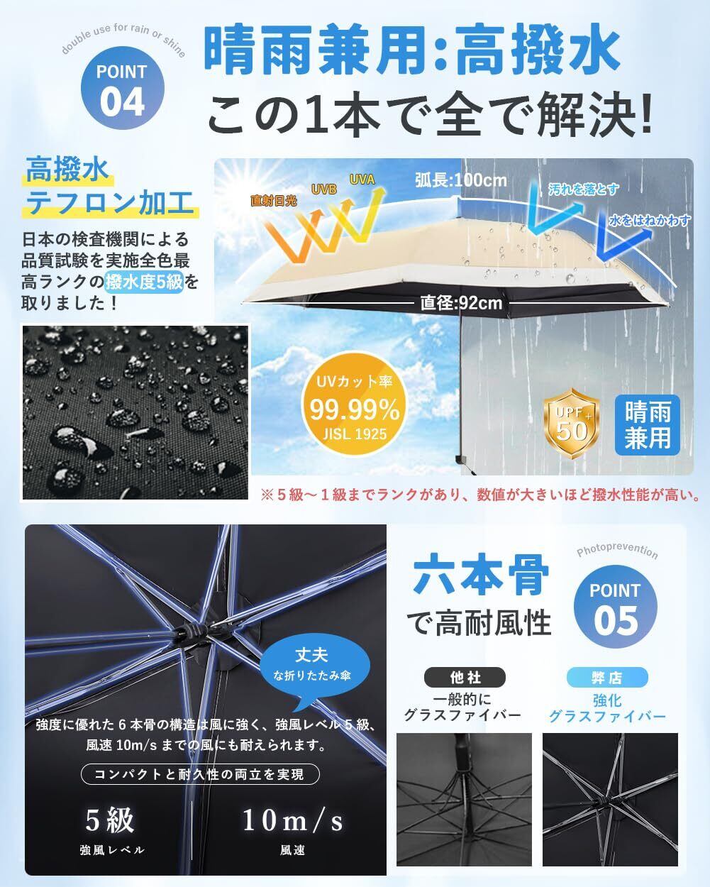 【超撥水&頑丈な6本骨晴雨兼用傘】高強度アルミ合金製中棒と、カーボンファイバー6本骨が錆びにくくて、しっかりした骨組みに作られ、頑丈で壊れにくい折りたたみ日傘です。風にあおられて万が一裏返っても傘を閉じるだけで簡単に元戻り、雨、風にも安心できます。傘布は撥水加工され、通常の日傘より撥水性があり、短時間で水切り、軽く振るだけで雨水を払い落とせます。雨の日も、晴れの日も兼用でご利用頂けます。一年中季節問わず使うことができ、梅雨対策にもUV対策にも欠かせない優秀なアイテム!