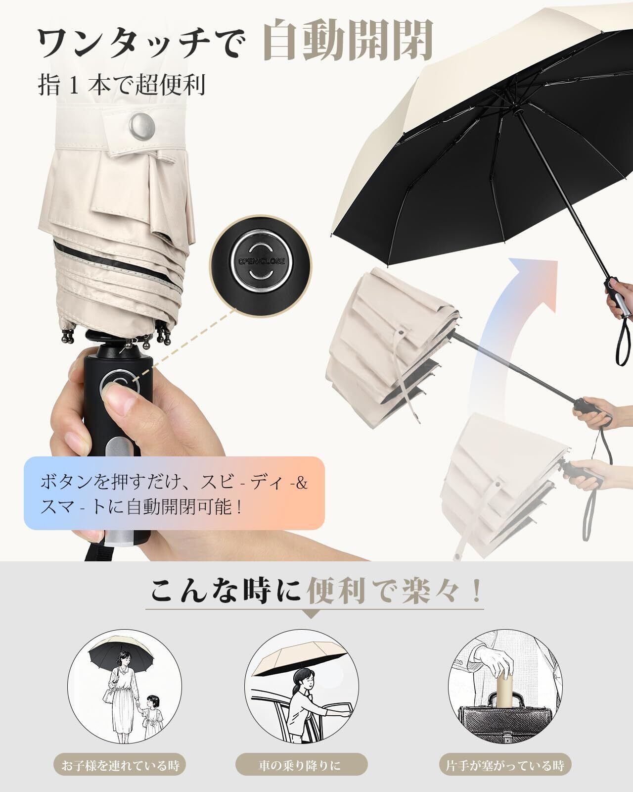 この折りたたみ傘は、ワンタッチでスムーズに開閉できる便利さと、高密度生地にテフロン撥水コーティングを施した超撥水機能を兼ね備えています。UVカット率99.9%で日差しからも守り、直径103cmの広い傘面は二人でもゆったり使用可能。軽量ながらアルミ合金とグラスファイバーを使用した8本骨構造で強風にも耐える耐久性を実現。シンプルで高級感あるデザインは日常使いから贈り物にも最適です。
