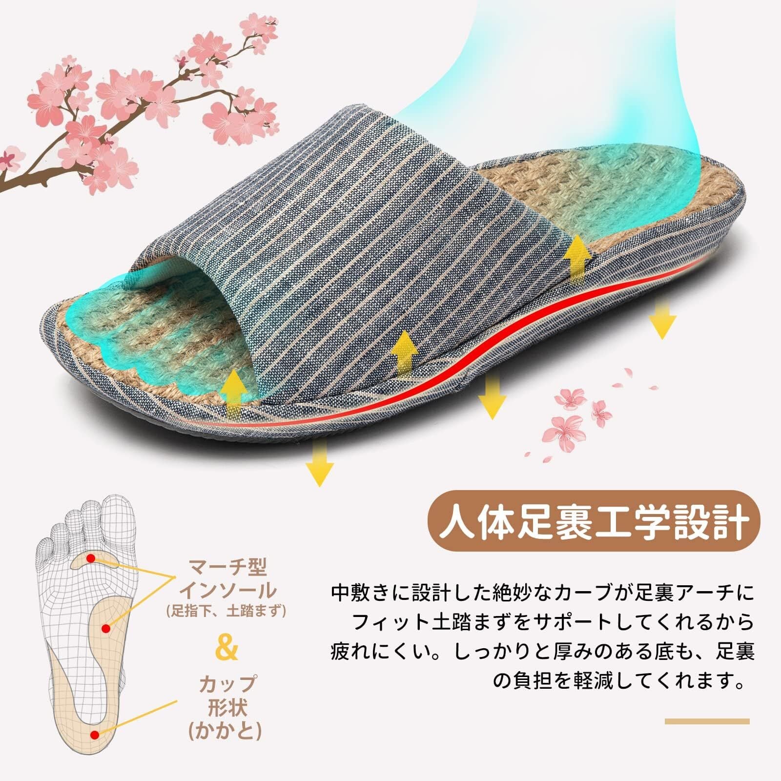 【履き心地良】足裏は厚いリネン素材を使って、編んだリネンのシャリシャリといた感覚が足裏を刺激してくれます。。マッサージ効果を兼有、自然な履き心地。長期間で使用でもほとんど変形しにくいです。ミッドソールが3cmと厚くぺらぺらではないにも関わらず、重さはワイシャツ1枚より軽い150gと軽量設計です。