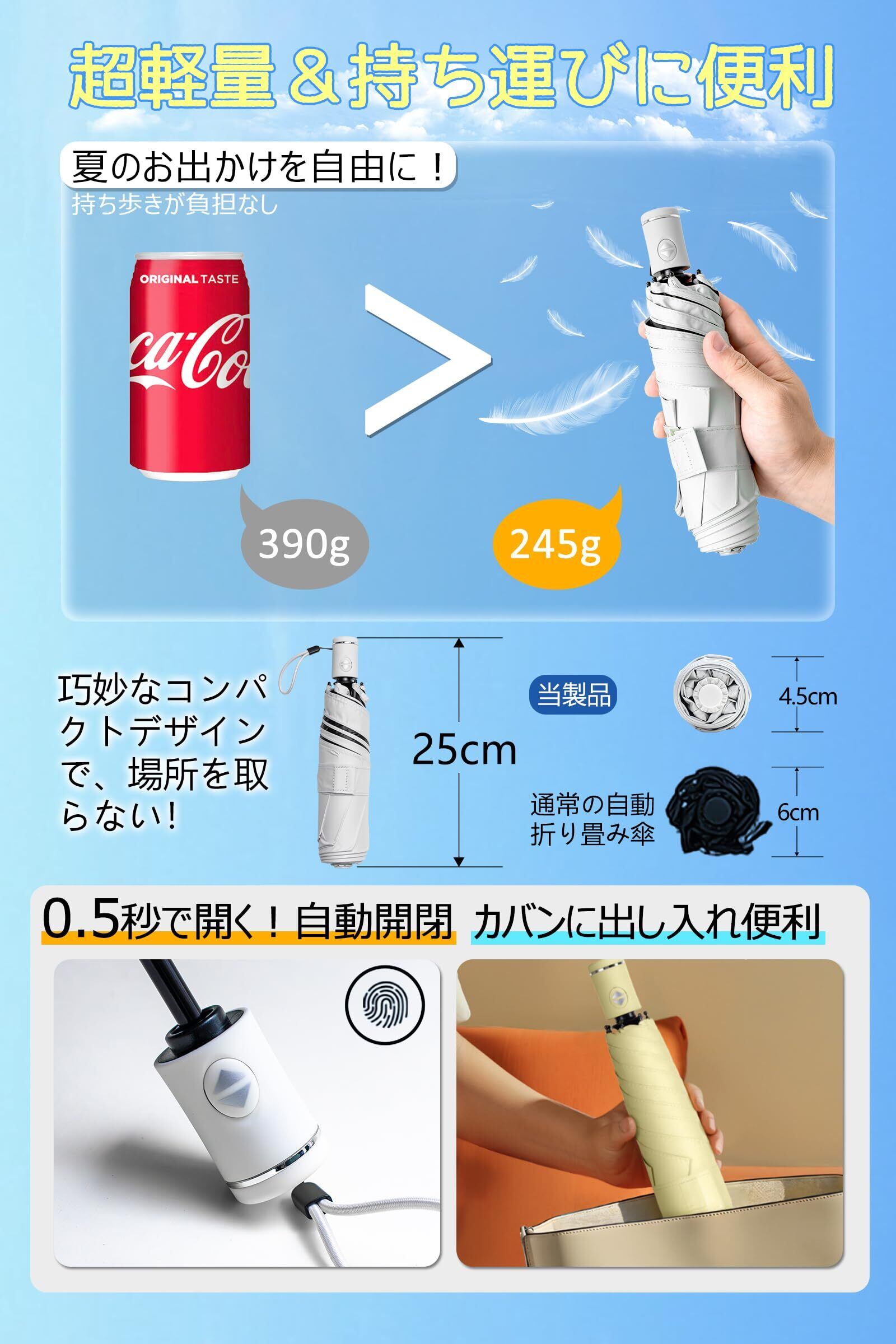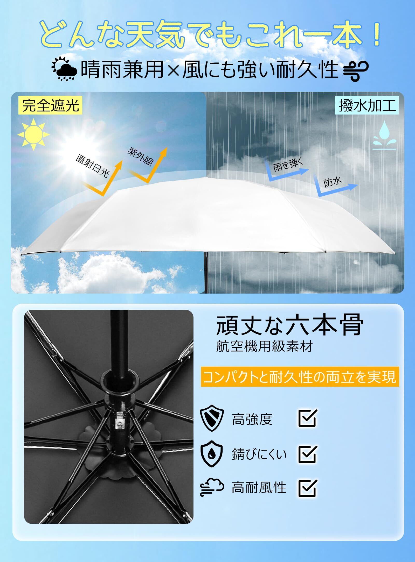 【形状安定&3秒で収納】夏の強い日差しからあなたを守る、スタイリッシュな日傘!革新的な形状安定技術で、わずか3秒で美しく折り畳める。普通の雨傘は折りたたみにくく、さらに日傘の場合、遮光設計により、傘布がシワになりやすいという大きな欠点を持っています。折りたたむとしんどくなります。こちらの形状安定日傘でそんな悩みを解消できます!傘面の裏側にPET樹脂プレートが貼り付けられており、折り目が定められたため、シワを大幅に減少する上に、傘を閉じた後、「半自動」で瞬時に畳め、きちんとした最初の形状に戻る!