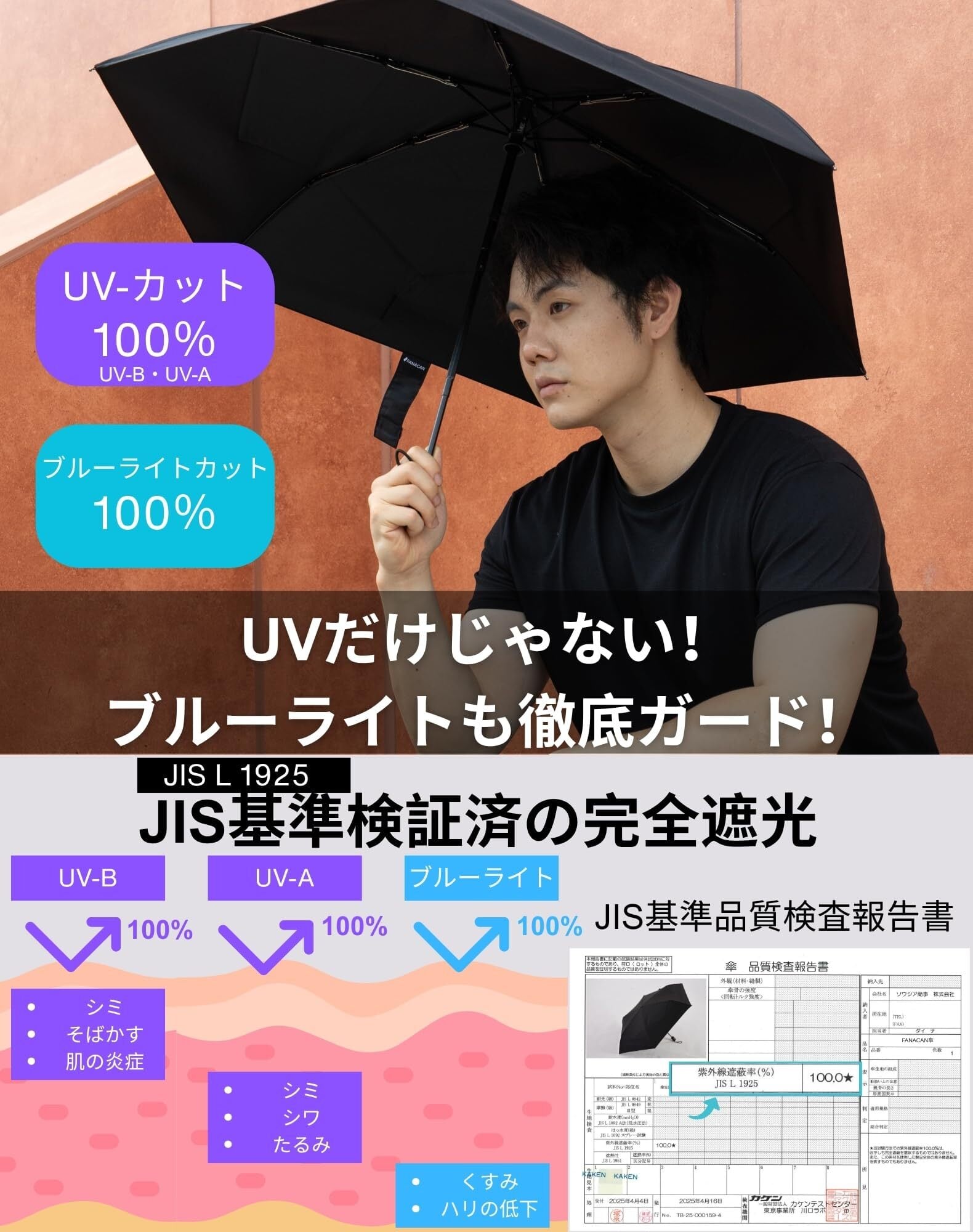 【完全遮光・UVカット100%・遮熱効果・QTEC認証済み】強い日差しも、紫外線も、熱気も、しっかりブロック!本製品は、日本繊維製品品質技術センター(QTEC)にて、JIS規格に基づく検査を実施し、「遮光率100%・UVカット率100%・UPF50+」を取得した高機能日傘です。生地そのものが光を通さない1級遮光仕様に加え、内側には特殊なフィルムラミネート加工を施すことで、遮光性だけでなく遮熱性・耐久性・高級感も兼ね備えました。日差しの強い日でも、体感温度を下げるようなひんやりとした使い心地を実感できます。