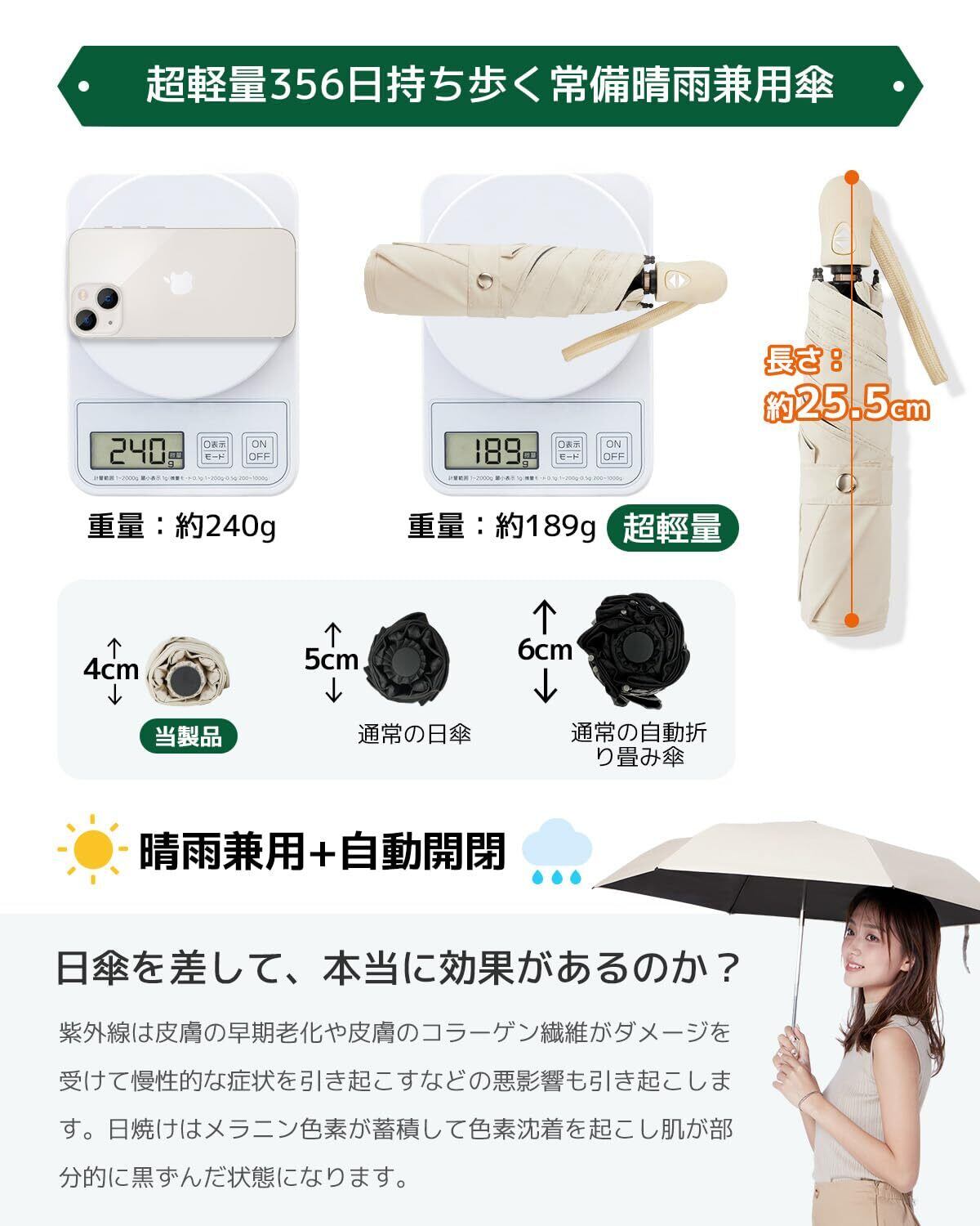 【超軽量*携帯便利】 折りたたみ日傘フラットなデザインで、バッグに簡単に入れることができます。折りたたんだ厚さはわずか4cm、長さは26cm、重さは約199gです。超コンパクトボディ 使用携帯に便利!全天候対応でき、雨の日も雪の日も晴天も使えます。男女兼用ワンタッチ 自動開閉折り畳み傘。通学、通勤、遠足、旅行,出張などの場合がご利用できます。