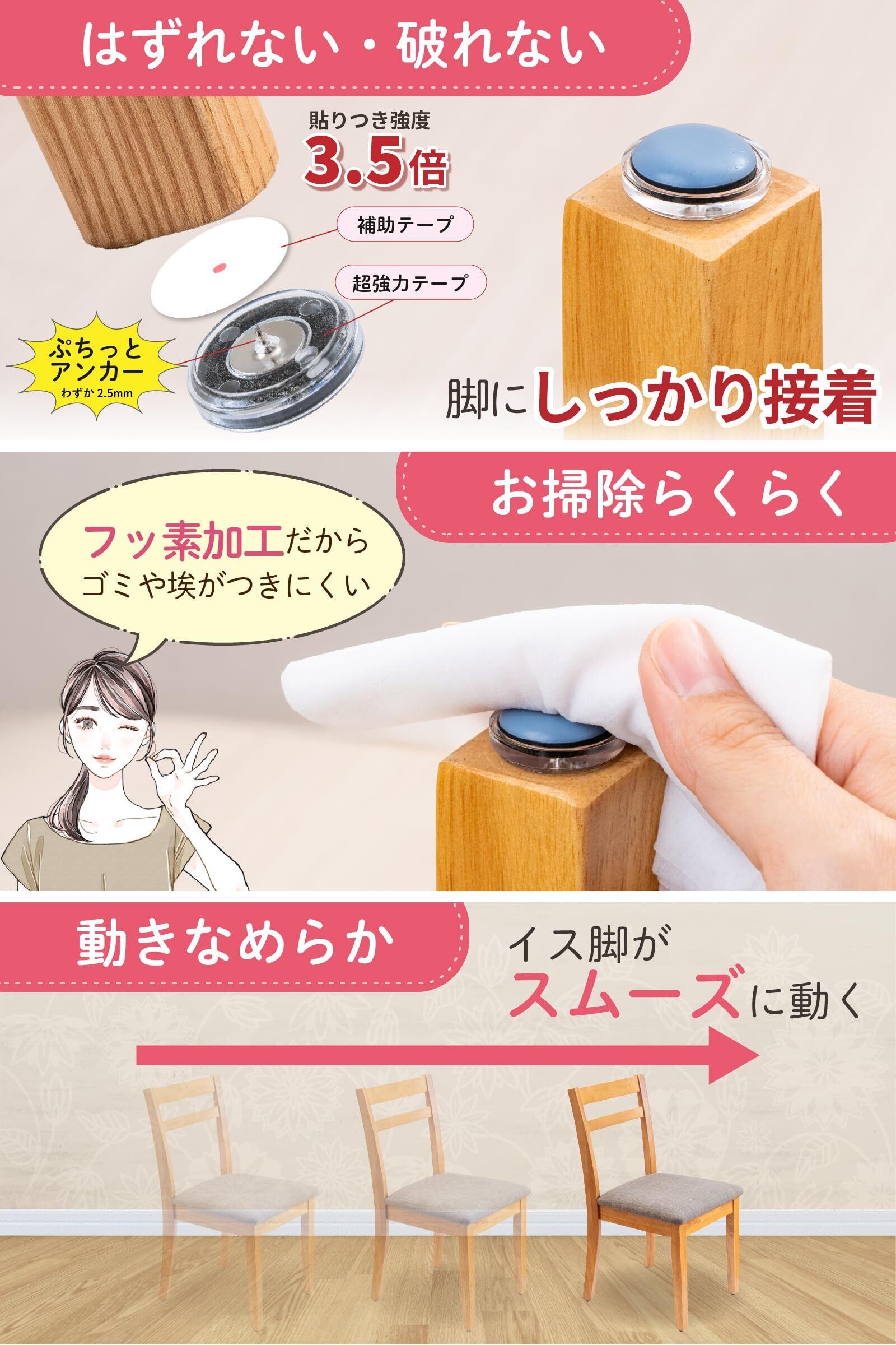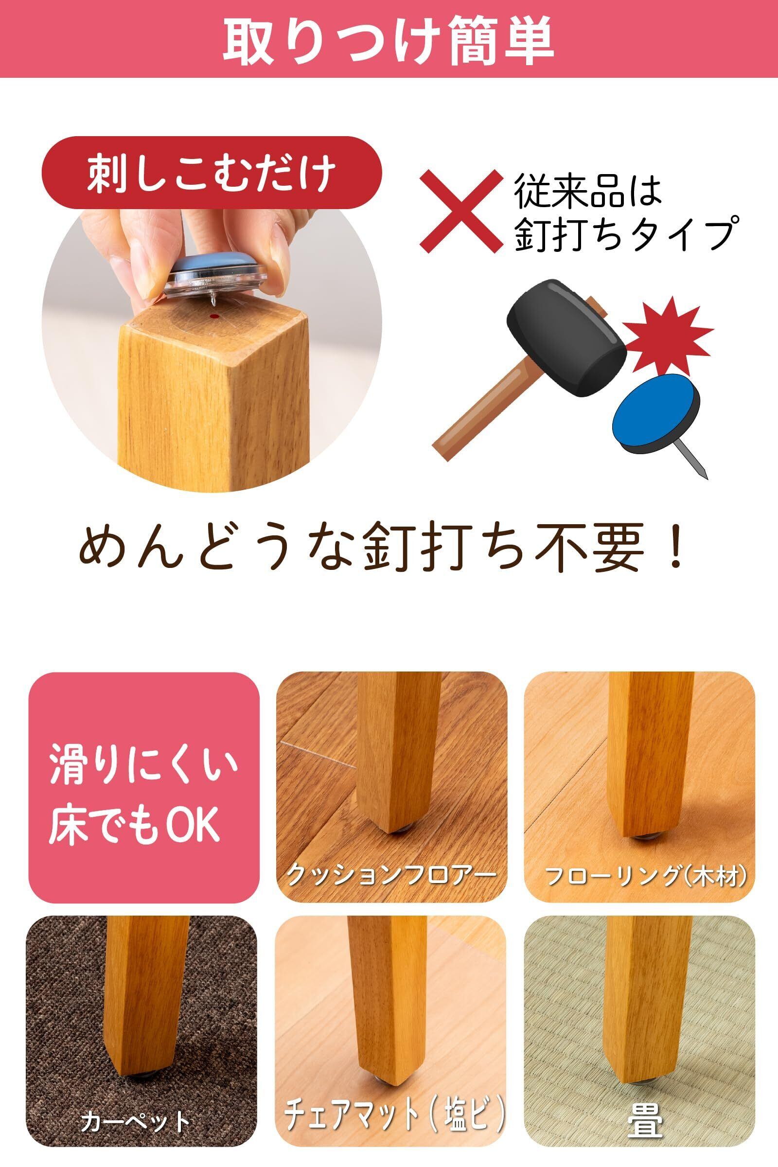 【ぷちっとアンカーでしっかり固定】 第7638496号の固定技術により、椅子脚に強固に食いつき取れにくい構造になっています。 両面テープのみの取付に比べて3.5倍の取付強度になっています。取付け易くしかもしっかり取り付くことにこだわり、数多くの試作を繰り返した結果、短い1本釘を採用しました。