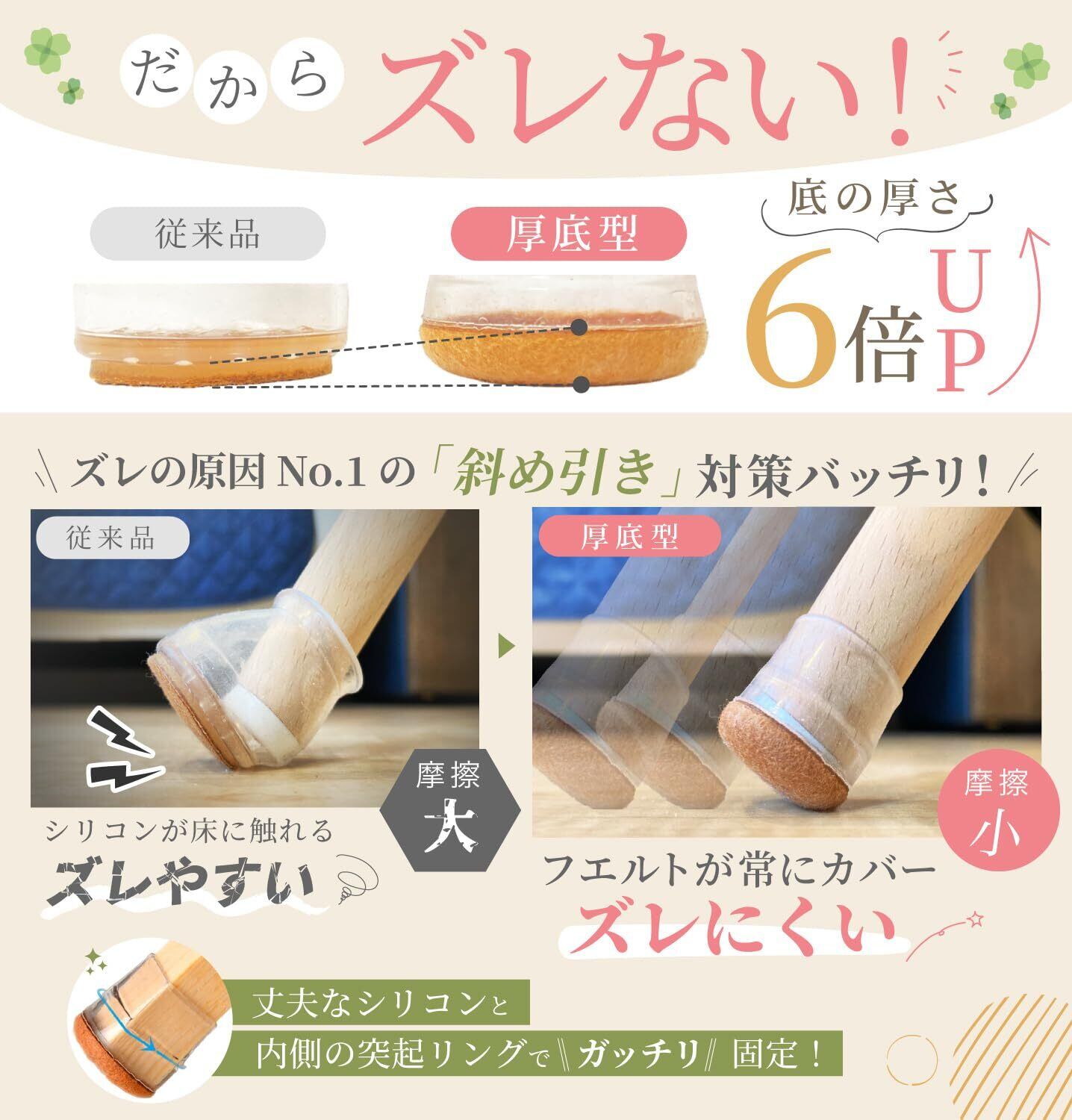【ズレずにもっと長持ち】底面フェルト厚さが6倍UPの厚底型が登場しました。摩擦への耐久性が向上したことでより長く使えます。イスを傾けて引いても、厚いフェルトが常に床を保護しながら摩擦を抑えるので簡単にズレません。カバー内側にあるリング状突起がガッチリと椅子脚を固定します。※一般型と厚底型の2種類あります。