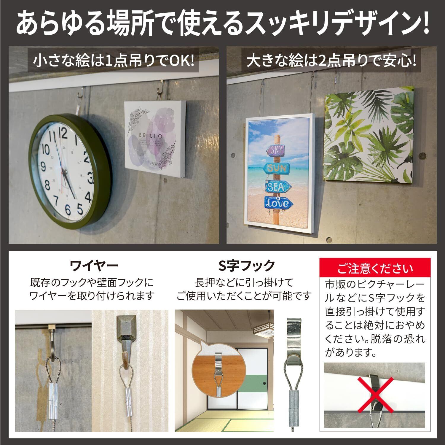 【あらゆる場所で使えるすっきりデザイン】小さな絵は1点吊りで、大きな絵は2点吊りでご使用ください。ワイヤーには壁面フックやレールフックなどにひっかけてください。付属のS字固定具は長押などにひっかけ、ワイヤーをひっかけて頂くことが可能です。 ※市販のピクチャーレールなどにS字フックを直接ひっかけるのはやめてください。脱落の恐れがあります。
