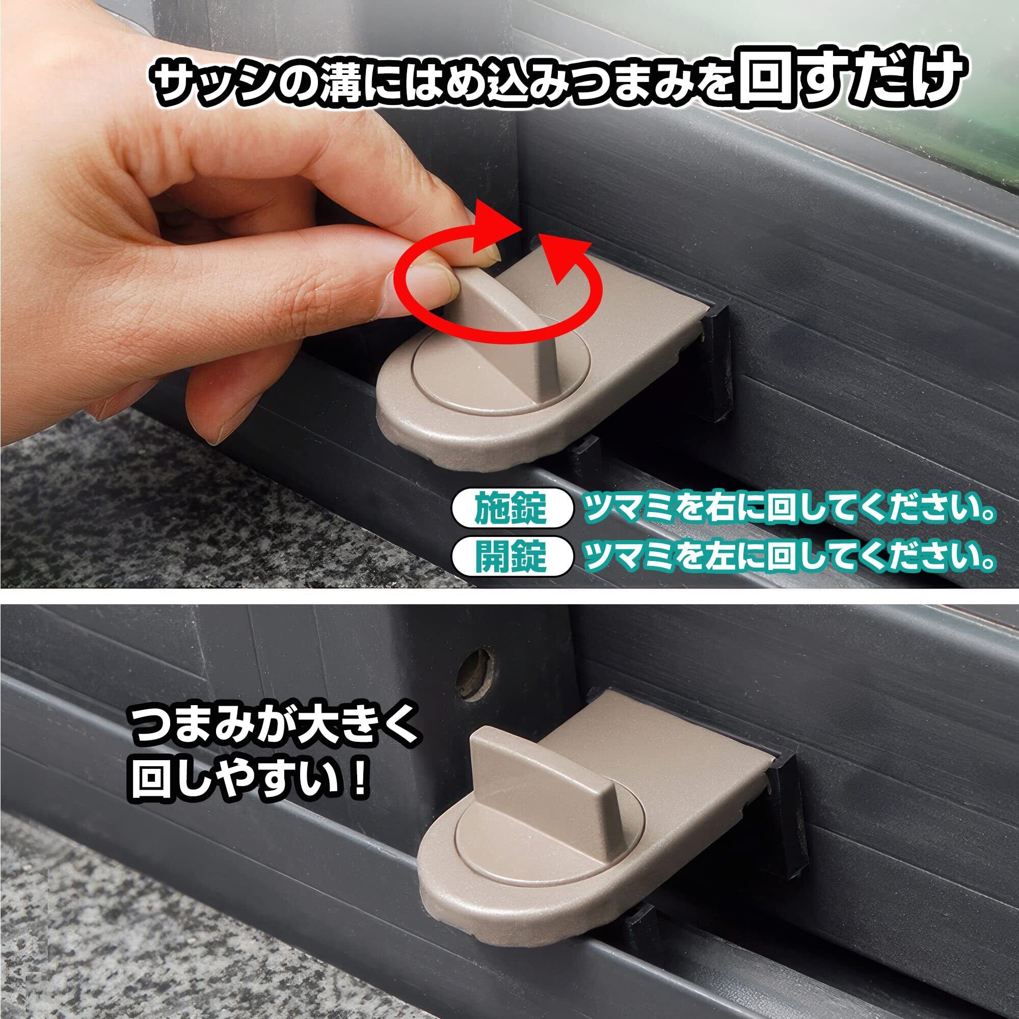 【サッシ窓用補助錠、安全対策に】サッシ窓につける補助錠です。サッシの溝に差し込んでつまみを回転だけで簡単に設置できるのサッシ窓用補助錠です。サッシに取り付けて、窓からの侵入を防ぎます。空き巣や泥棒やひとり暮らし女性向けに防犯対策に、ペットや小さなお子さまのいる家庭の安全対策としてもご使用いただけます。防犯効果を高めるためできるだけ上下2箇所に取付けることをお薦め致します。盗難防犯に絶対的な商品ではありません、予めご了承ください。