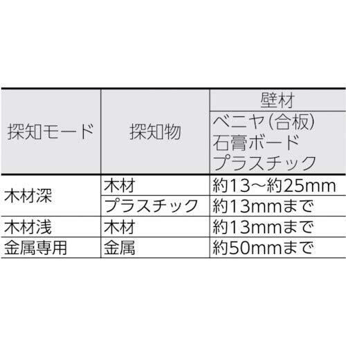 探知能力:【木材深】木材約13~25mm、プラスチック約13mmまで 【木材浅】木材約13mmまで 【金属専用】金属約50mmまで