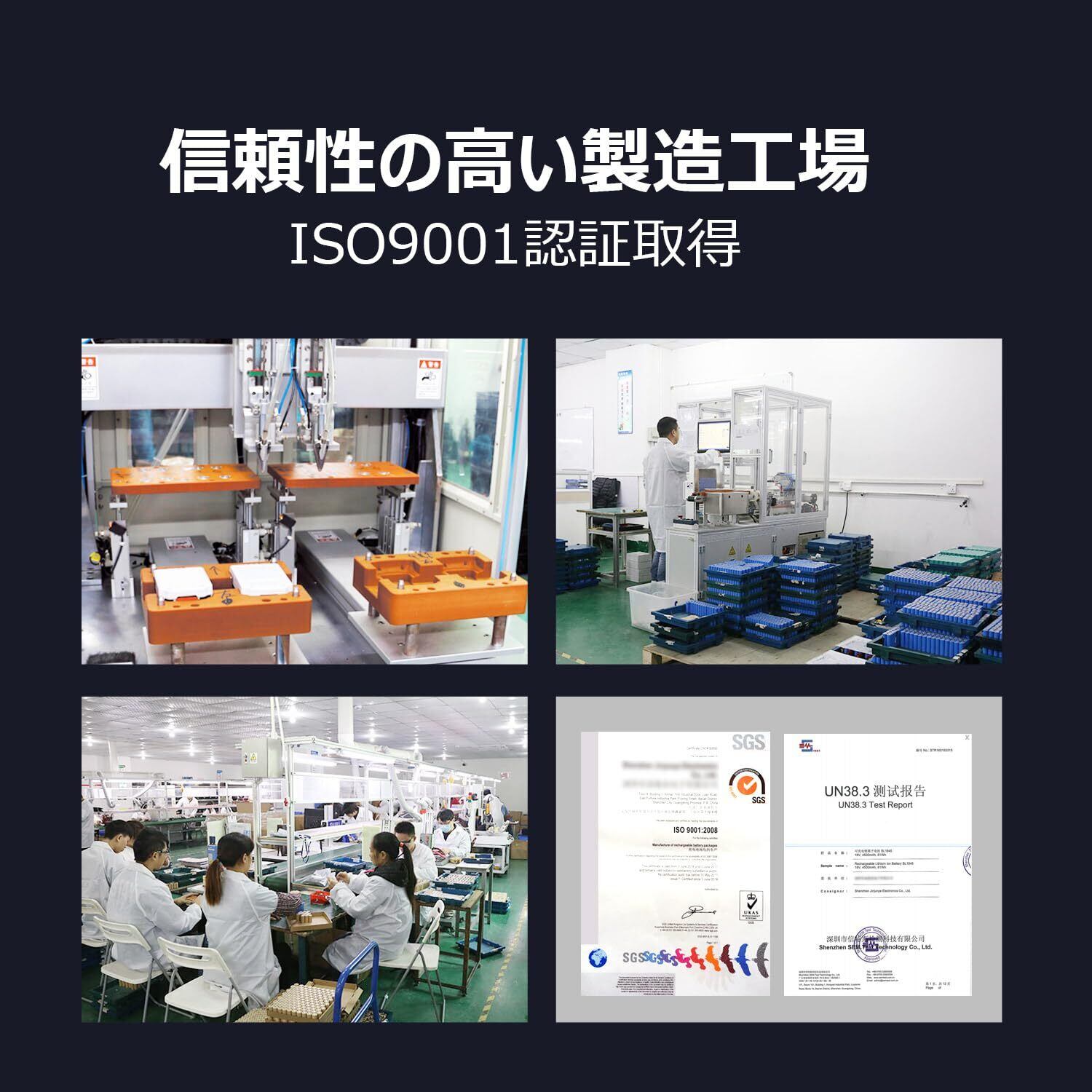 【保護機能】過充電保護、過放電保護、過電流保護、過電圧保護、過熱保護、短絡保護などの保護機能を搭載。また、内蔵のセルは、個別の電圧監視システムを搭載している高品質のセルを採用しています。IOS9001認証を取得している信頼性の高い工場にて製造しています。また、電気用品安全法の技術基準(別表第十二規格)に適合(PSEマーク表示)した製品ですので、純正品と同様に安心かつ安全にお使いいただけます。