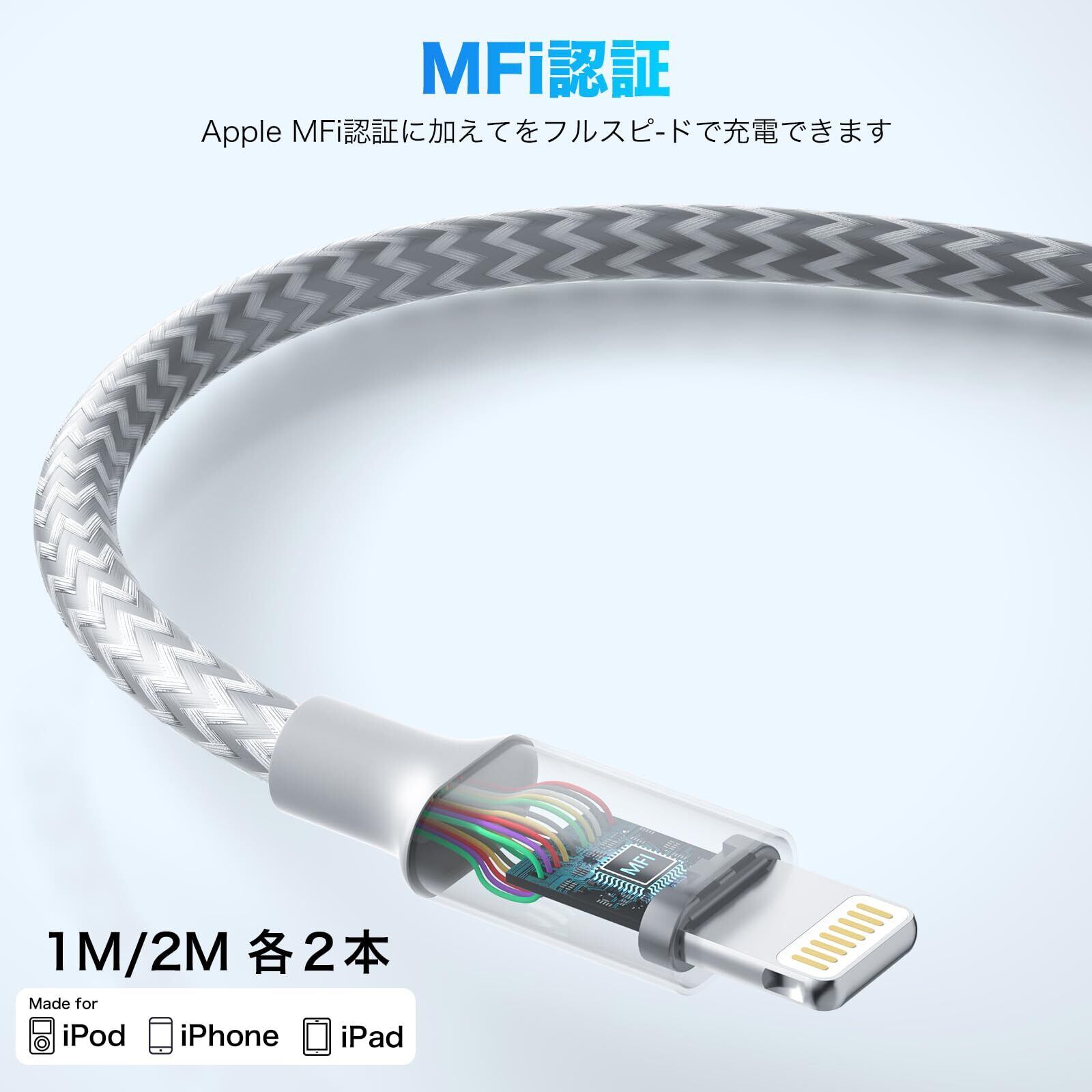 iphone 充電ケーブル【1M/2M 各2本正規MFi認証品】ライトニングケーブル 充電器 ケーブル 高速データ転送 最大2.4A急速充電 lightning ナイロン編み 断線防止 超高耐久iPhone14/14 Pro/13/13 Pro/12/11/X/8/8plus/7/6/iPad 各種対応