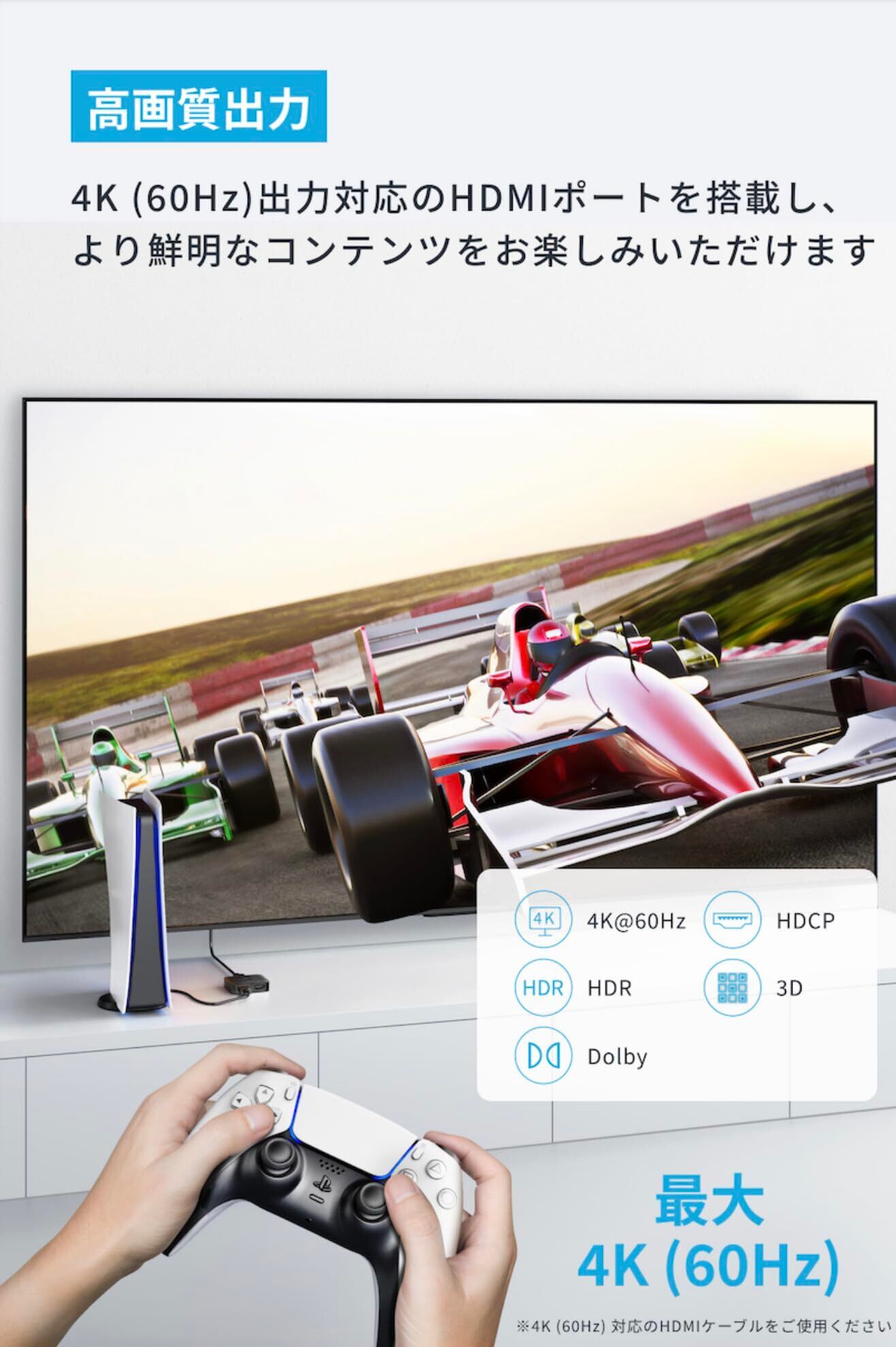 高画質出力:4K (60Hz) 出力対応のHDMIポートを搭載し、より鮮明なコンテンツをお楽しみいただけます。