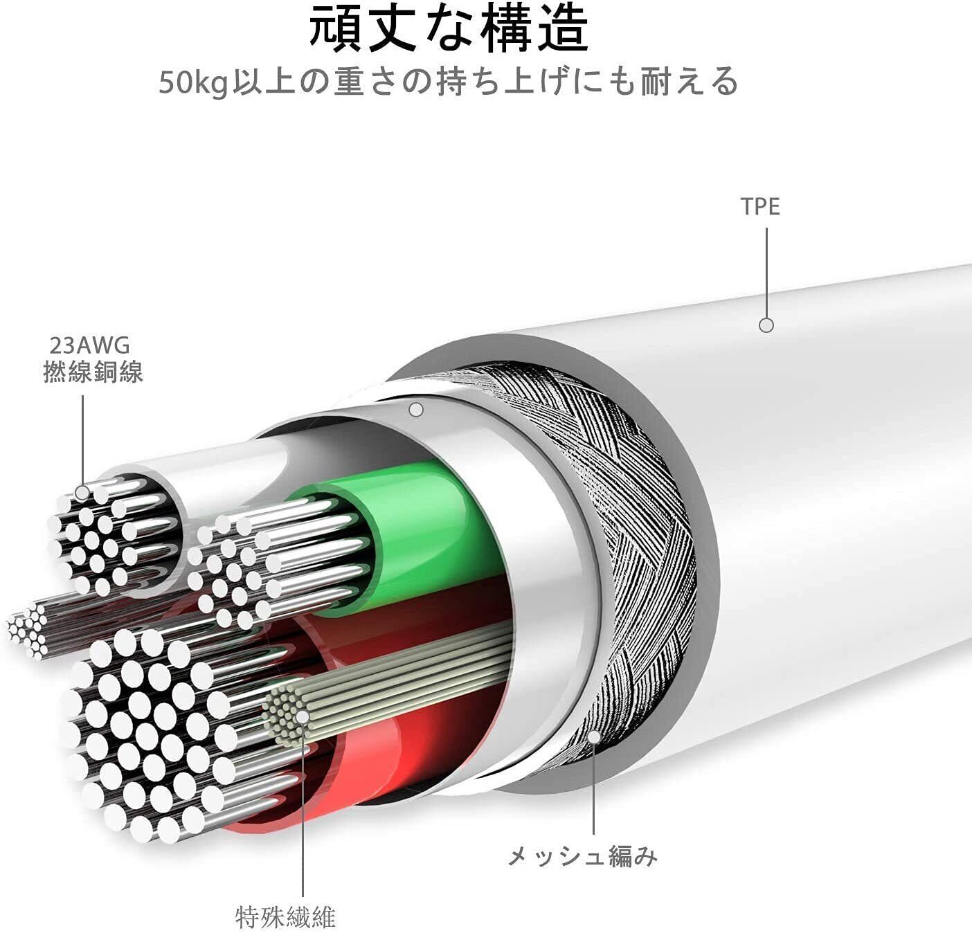 【優れた耐久性】耐久性を向上させ、ほつれを軽減するために、ライトニングおよびUSB側先端に保護層を追加しました。外部は厳選された優れたTPE素材によって覆われ、柔軟性がよく耐久性に優れます。8000回以上の折り曲げテストに合格しており、内部の無酸素銅、アルミ箔なども劣化しづらく耐磨耗性に優れています。コネクタの根元部分も耐久性に優れた造りで、断線しにくい丈夫なつくりのiPhone充電ケーブルです。