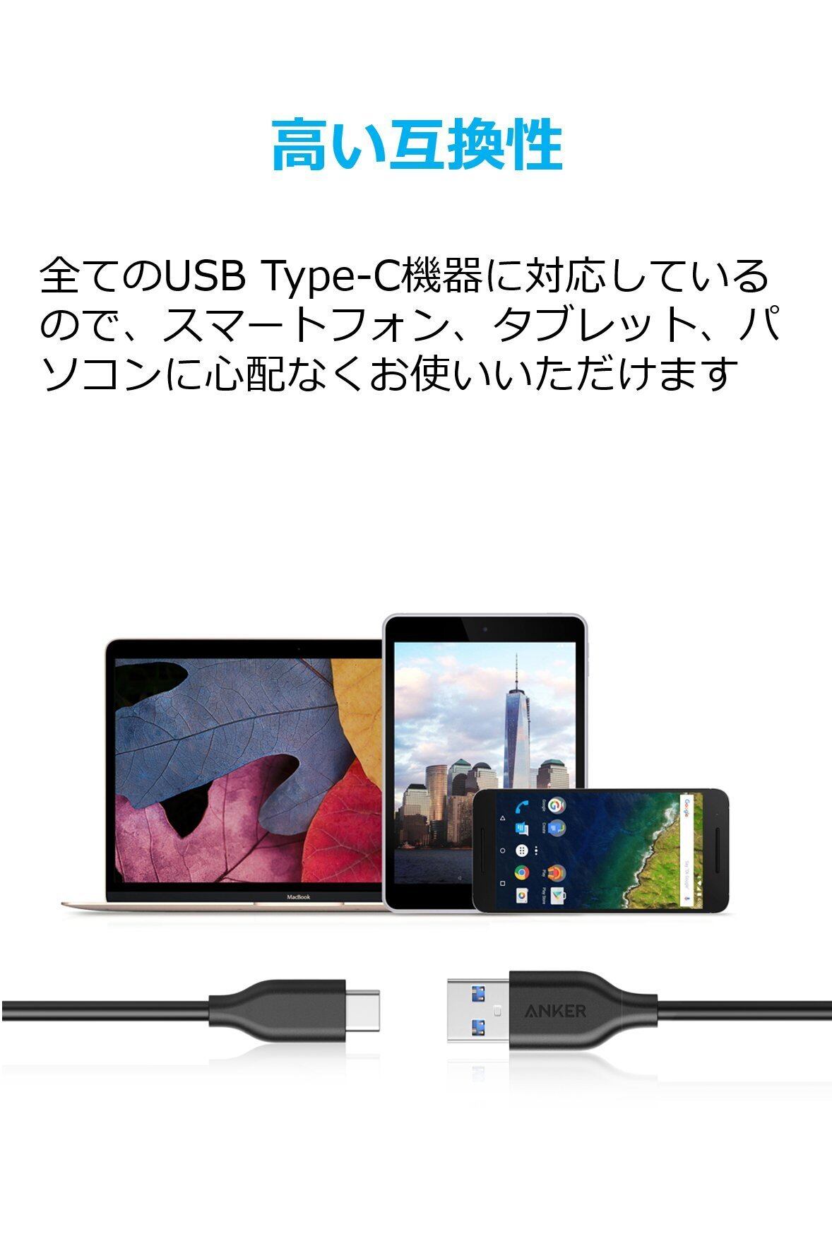 パッケージ内容:Anker PowerLine USB-C & USB-A 3.0 ケーブル(0.9m ブラック)、カスタマーサポート