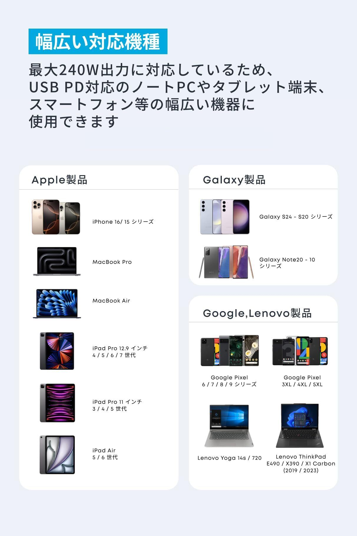 フルスピード充電:最大出力240Wの高出力で、スマートフォン、タブレット端末、ノートPC等のUSB-C端子機器にフルスピード充電が可能です。