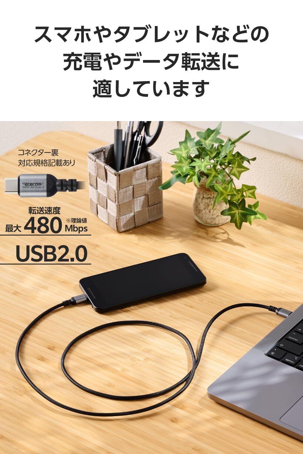 スマートフォンもパソコンも、これ1本で高速充電。USB2.0、USB Power Delivery(最大100W)対応のUSB Type-C(TM)ケーブル。断線に強い高耐久タイプです。