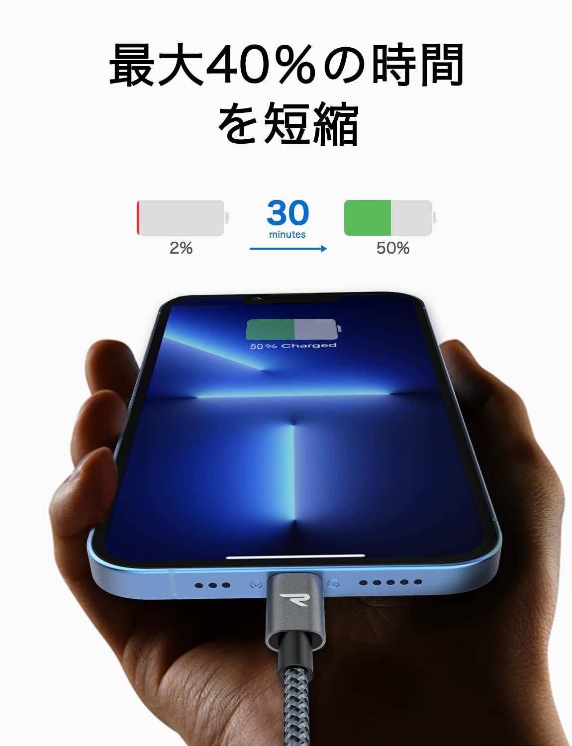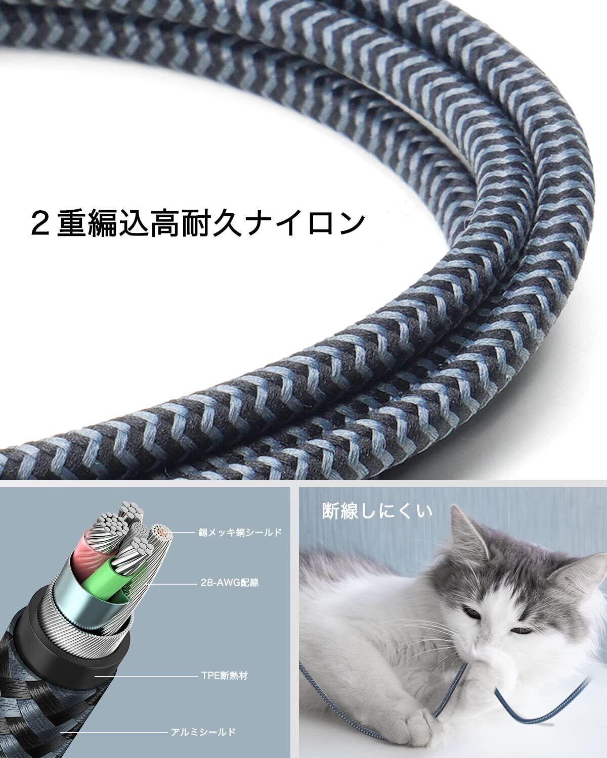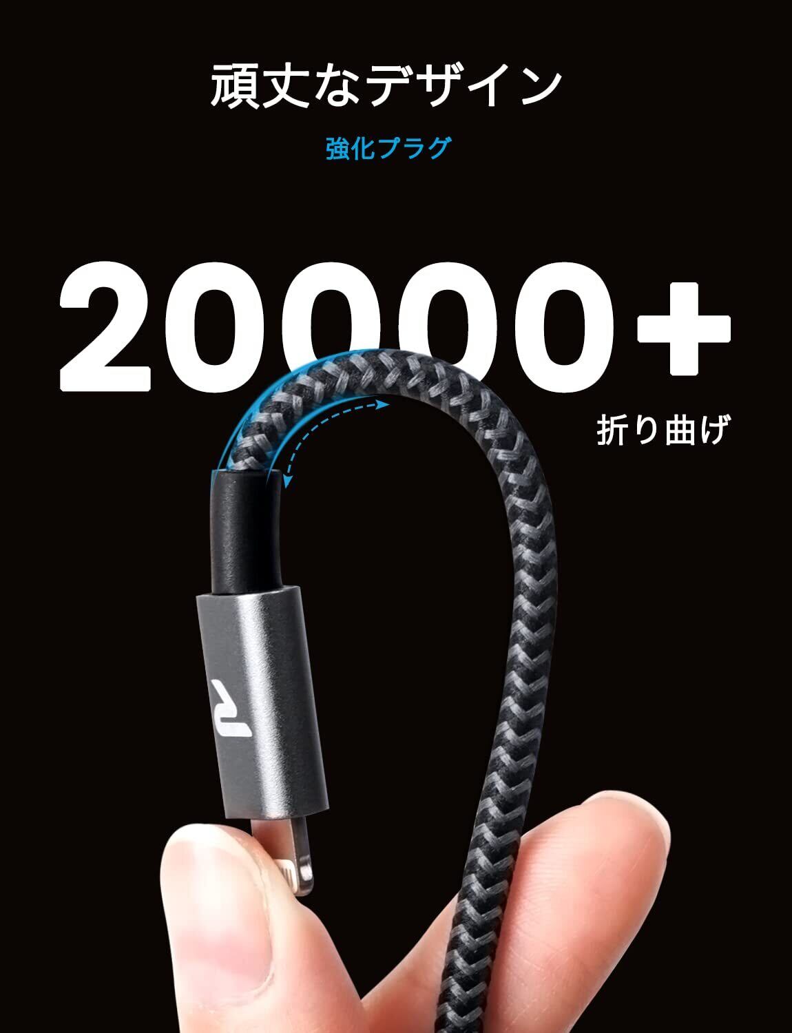 【高耐久性】品質の向上と抜き差しの安定性を高めるため、柔軟性と耐久性を兼ね備えた二重編込ナイロン素材を採用し、曲折テストの回数は元の7,000回から20,000回まで増加され、断線しにくい超高耐久のiphone 充電ケーブルです。