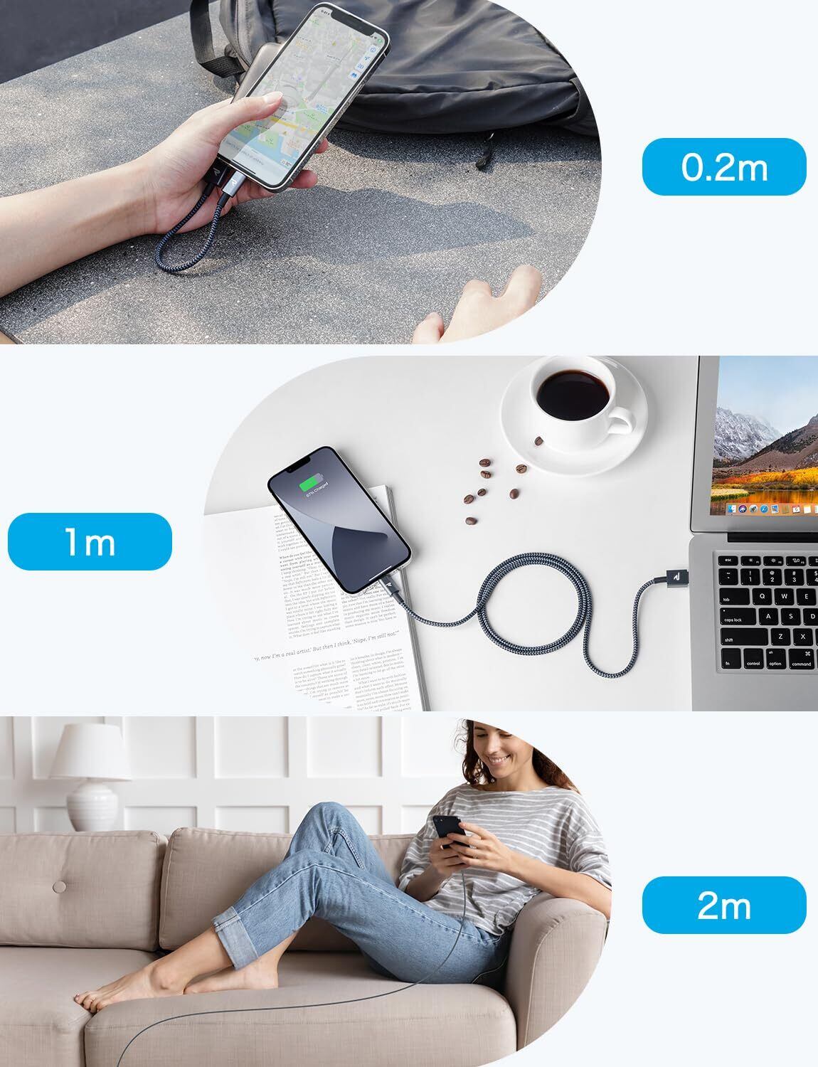 【持ち運びに最適!】この短いiphone ケーブルはわずか20センチなので、外出時にモバイルバッテリーと接続し持ち歩いて、或いはカバンやポーチにの中に入れて持ち運んでも場所が取らずとても便利です。 また、ノートパソコンでの充電や同期にも、車載用途にも、ちょうど良い長さです。
