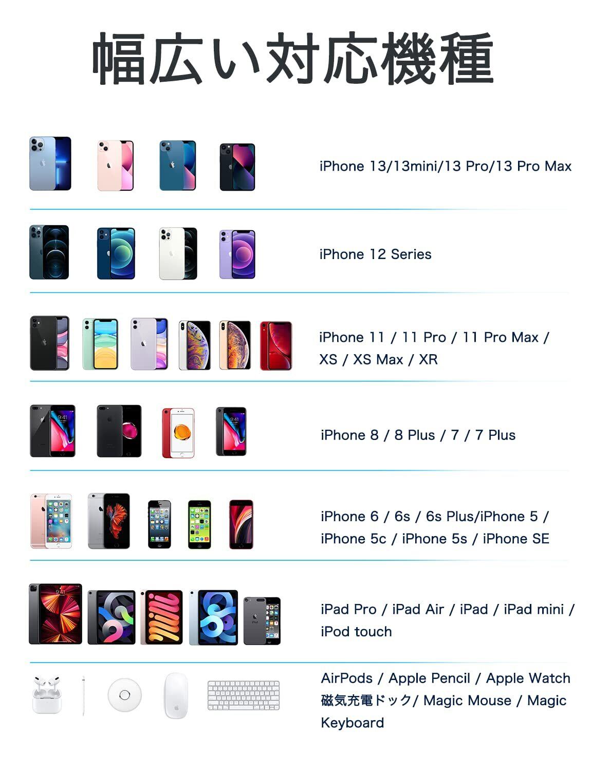 【幅広い互換性】iosアップデート完全対応、iPhone 14シリーズ/iPhone 13/13 mini /13 Pro/13 Pro Max / 12/ 12 mini/ 12 Pro/ 2 Pro Max/ 11/ 11 Pro/ 11 Pro Max/ XS/ XS Max/ XR/ iPhone X / iPhone 8 / 8 Plus / iPhone 7 / 7 Plus / iPhone 6s / 6s Plus / iPhone 6 / 6 Plus / iPhone 5 / 5s / 5c / iPhone SE / iPad Air / Air 2 / iPad Pro / iPad mini / iPod touch / iPod nanoなど8Pinの接続口が全部対応しているアイフォン充電ケーブルです。
