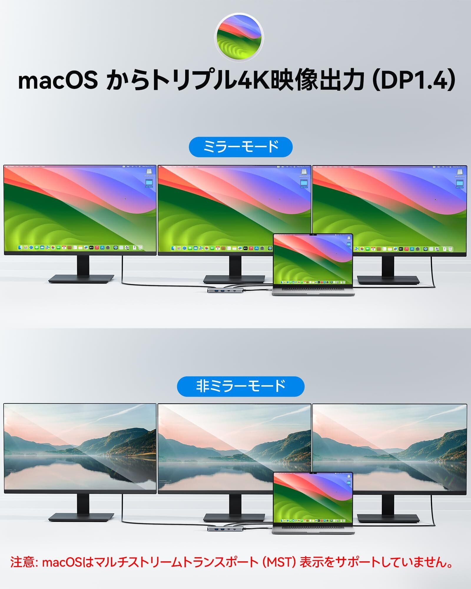 【最大3台のデスプレイに4K高精細映像出力】HDMIポート×2とDisplayPort×1で最大3画面出力可能なUSB Type-Cドッキングステーション 3画面出力。モニターを使って大画面で作業をしたり、USBメモリでデータをやり取りしたりすると、ポートが不足しがちになります。このマルチモニター 3画面ドッキングステーションを使うことで、モニターを増やしたり、周辺機器をよりパワフルに使えたりするようになります。【ご注意】:①、4K/60Hzを利用するには、PCがDPort 1.4 Alt Modeに対応必要。②、PCはIntel第10世代以前のプロセッサーの場合は、2つのディスプレイを拡張しかできません。③、MAC接続時のご注意:この製品はMACの外部モニター2台以上の拡張モードをサポートしていません