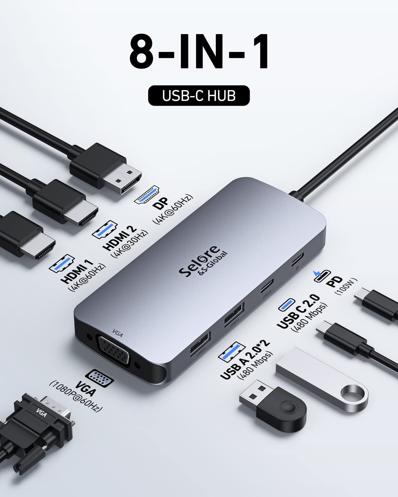 【8in1 USB C ハブ & 利用条件】この多機能ドッキングステーションはHDMIポート×2(4K@60Hz/30Hz)、Displayportポート(4K@60Hz)、VGAポート(1080P)、PD Port (max 100W)、 USB 2.0ポート×2ポート、USB C 2.0ポートを備えています。合計8もの入出力を搭載し、複数の接続ケーブルを持ち歩く必要はありません。幅広い互換性あり MacBook/MacBook Pro/Air/Chromebook/Huawei/Dell/HP/Lenovo/ASUS/Samsung/LGなどに対応。【ご注意】このUSB-Cドッキングステーションを使用するには、コンピュータのUSB-Cポートが全機能(USB-C 3.2 Gen 2 & DisplayPort対応)、またはThunderbolt 3/4 に対応している必要