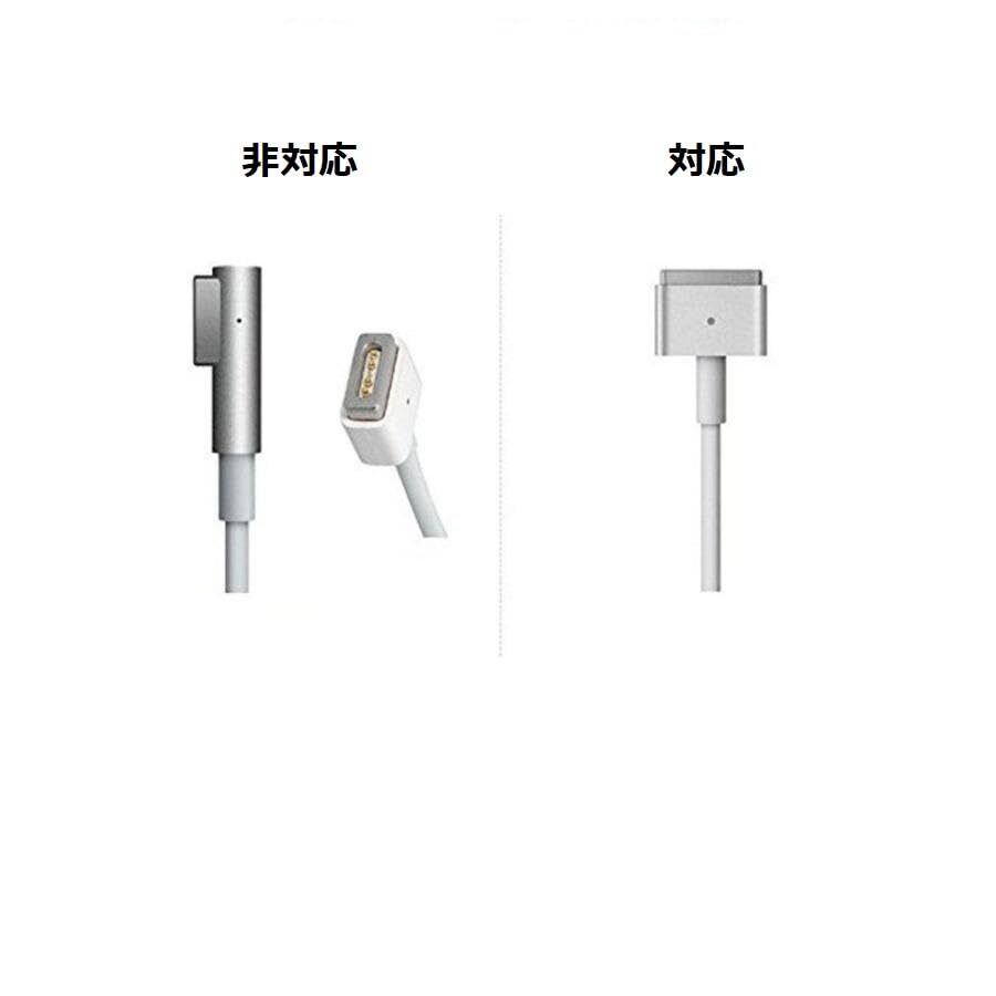 Macbook AIR/Pro など対応 Magsafe2 60W 互換 電源アダプター *購入間違え多発のため、ご購入前ご注意:当商品は2012中期-2015初期 Macbook Air、Macbook Pro専用アダプター、互換アダプタ形式は「Magsafe 2」のみです。外観は「Magsafe 3」と類似しているが、対応しません。 対応詳細型番、下部対応表をご参照ください。 コネクタ部分熱い場合、本体接続部分汚れをご清掃お願いいたします。