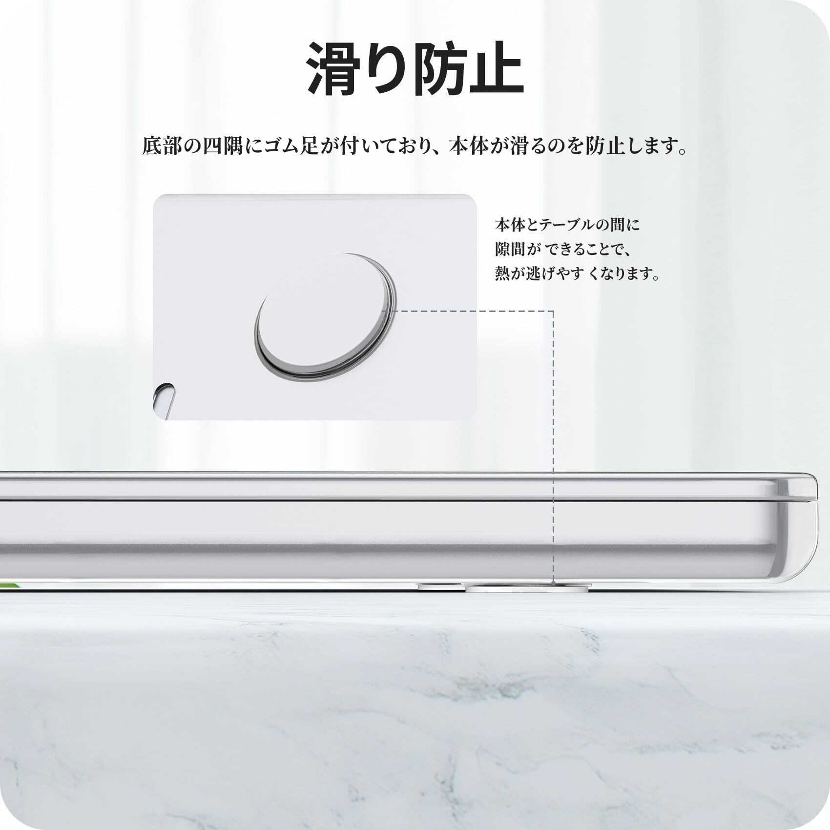 高い通気性:D面のカバーには穴が開いており、通気性及び放熱性が良いです。また、D面に4つの滑り止めパッドがついており、机等との間に空間ができ、空気の流通がしやすい構造です。
