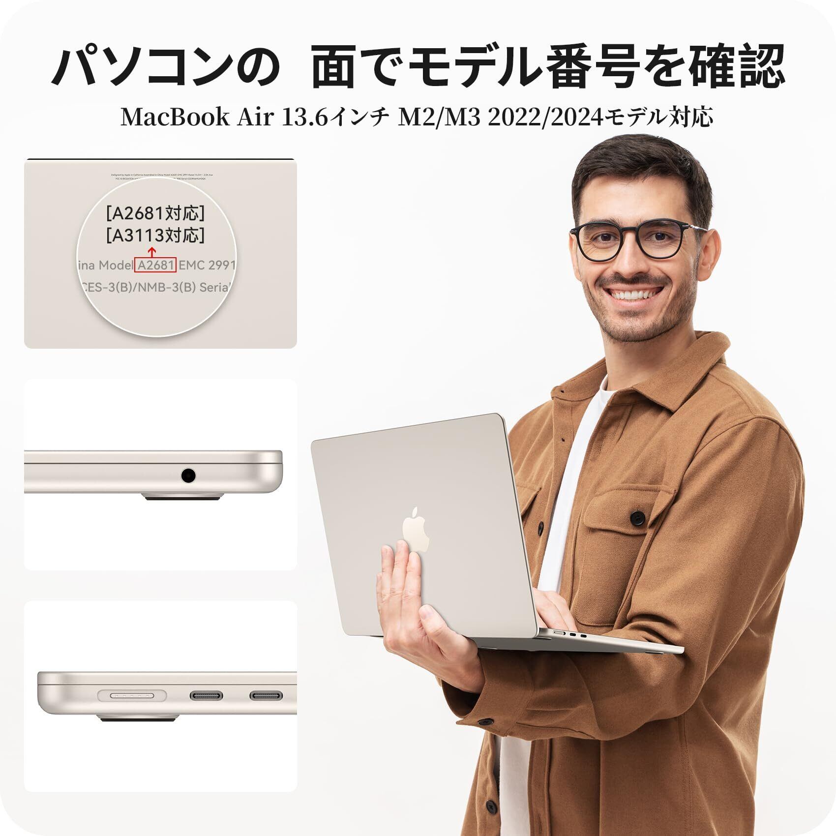 対応機種:MacBook Air M2チップ(2022モデル)/M3チップ(2024モデル)/M4チップ(2025モデル)13.6インチ 対応。 モデル番号:A2681対応(2022モデル)/ A3113(2024モデル)(ご注意:MacBook Air 13インチ用 2018-2020モデルに対応できません。)