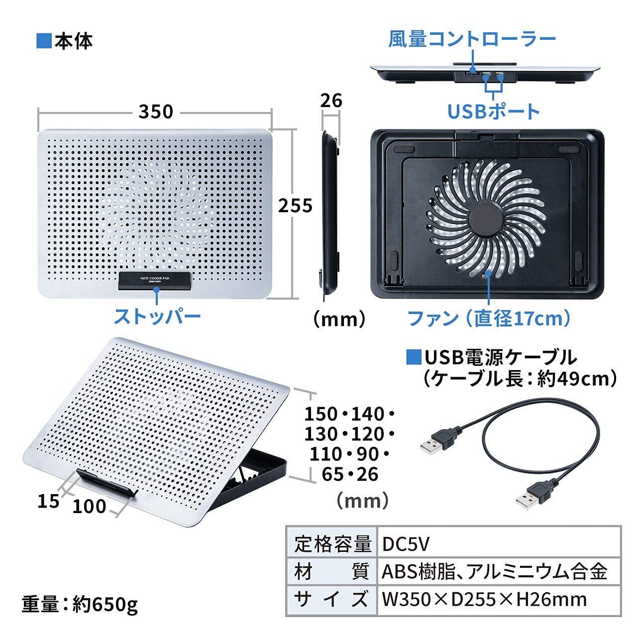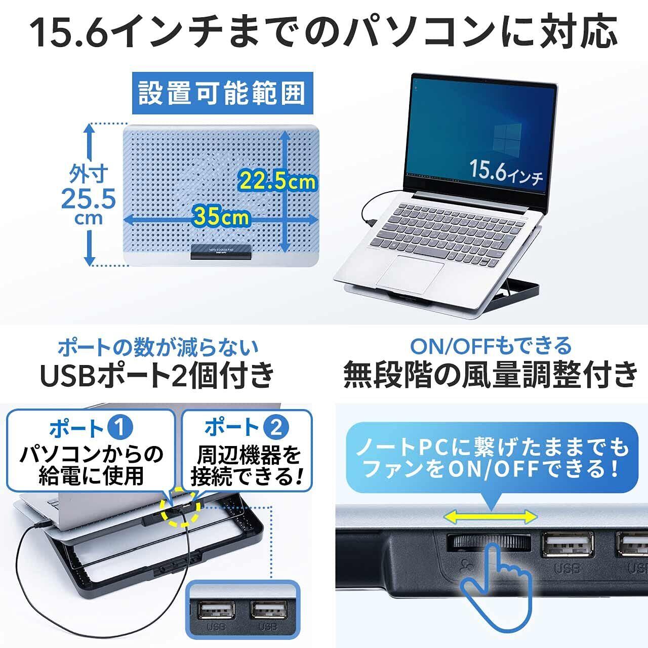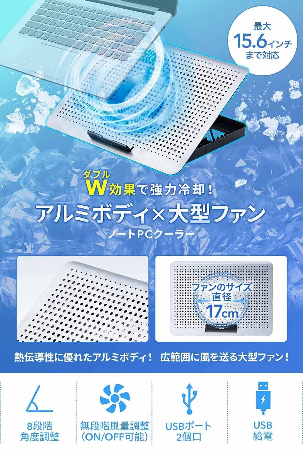 サンワダイレクト ノートパソコンクーラー 冷却台 アルミ 15.6インチ対応 静音 角度8段階 風量無段階 USB2ポート USB給電 400-CLN031