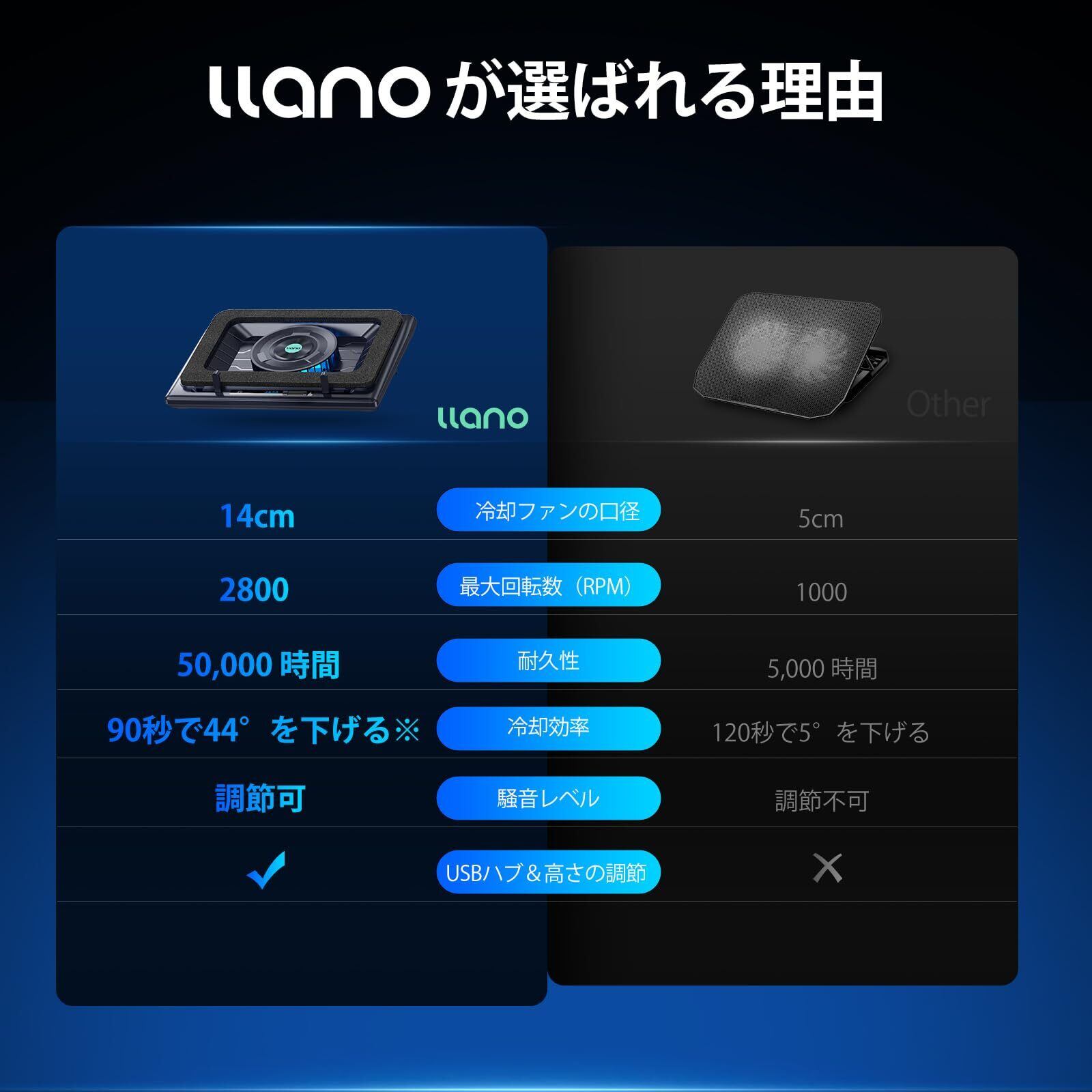 【一目で分かるLEDディスプレイと風量調節機能】llano ノートpc 冷却ファンフは使い心地から考えており、ノートパソコンクーラーにはリアルタイムのLEDディスプレイが設置され、スクロールボタンで回転数を簡単に300~2800RPMに調節でき、気温の変化、使用環境などに合わせて、冷却風力と騒音レベルの理想的なバランスを瞬時に調整します。(回転数が高いほど冷却効果が強くなり、駆動音も大きくなりますので、騒音ラベルをご参考まで:300~1000rpm 46~56dB;1000~2000rpm 56~68dB;2000~2800rpm 68~73dB)駆動音と冷却効果のバランスを取って、理想的な冷却環境を作り出すため、オススメ回転数は600RPM。