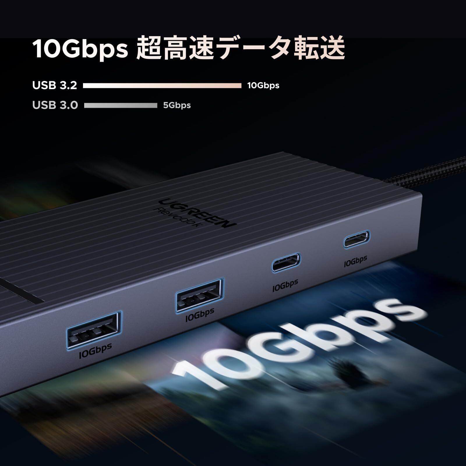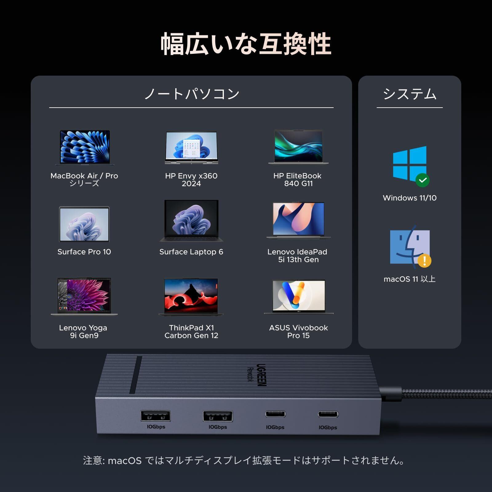 【7 in 1 USB C ドッキングステーション】UGREEN ドッキングステーションには、HDMI 2つ、10Gbps USB A ポート2つ、10Gbps USB C ポート2つ、PD 100w 充電転送ポートが付属しています。マルチスクリーンで最高の解像度を得るためには、11世代以上のCPUを搭載したPCを使用することをお勧めします。
