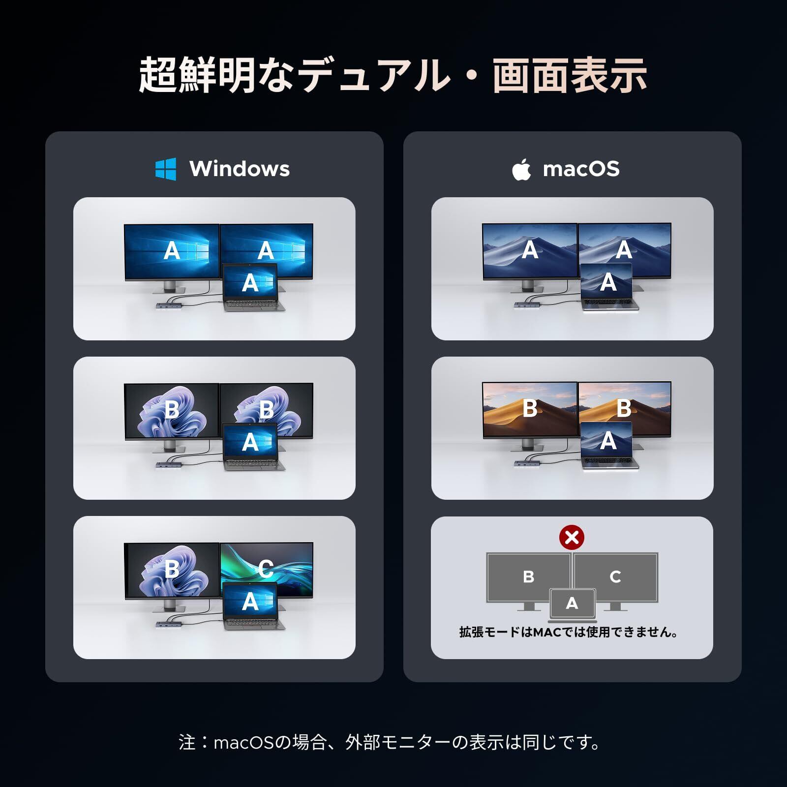 【幅広い適応性】 Type-Cドッキングステーションは、MacBook Air M1/M2、iMac、ThinkPad X1、ZenBook、iPad Pro、Chromebook、Surfaceなどと互換性があります。注: Windowsシステムは拡張デュアルスクリーンディスプレイを利用できますが、Macデバイスはミラーモードに制限されています。