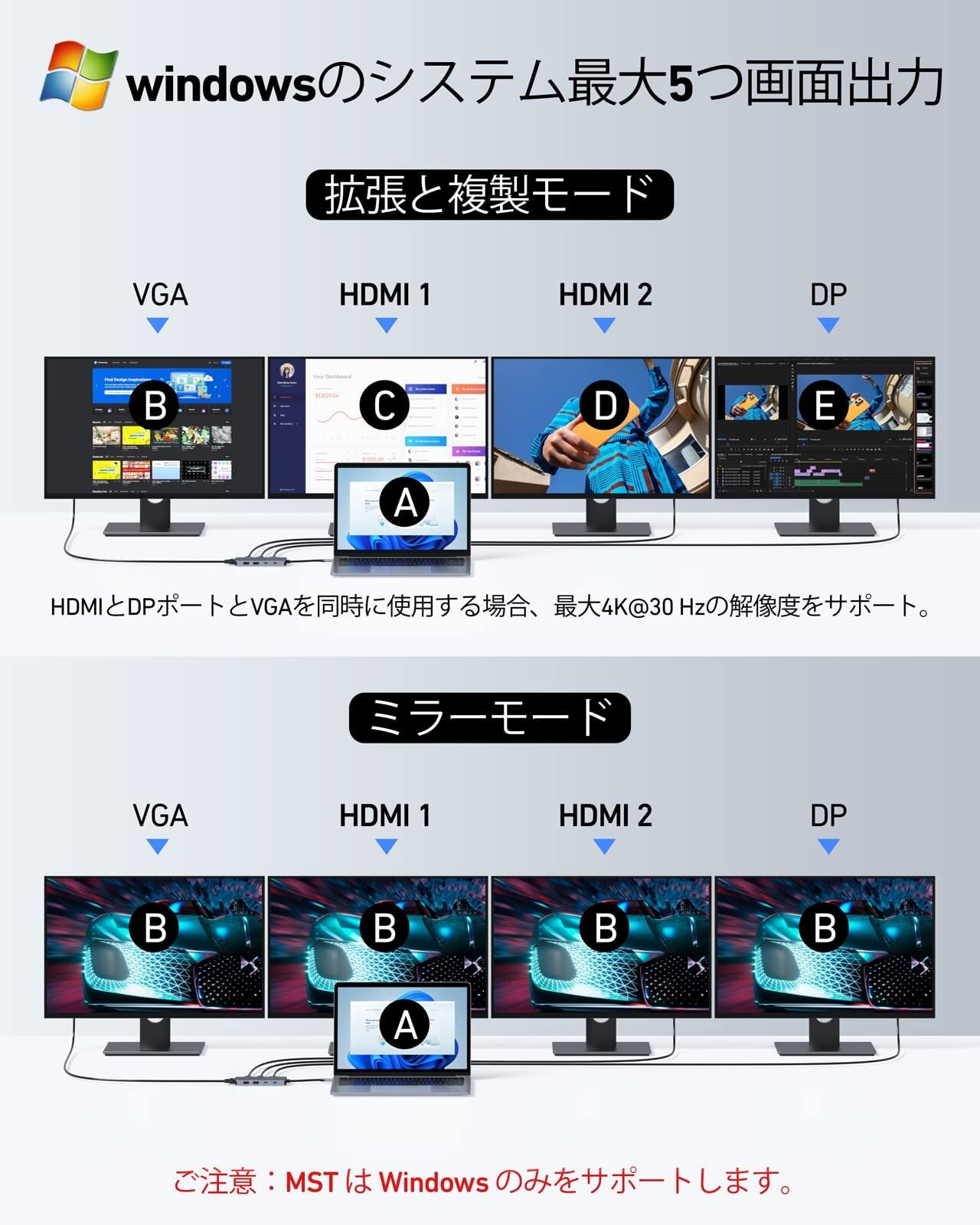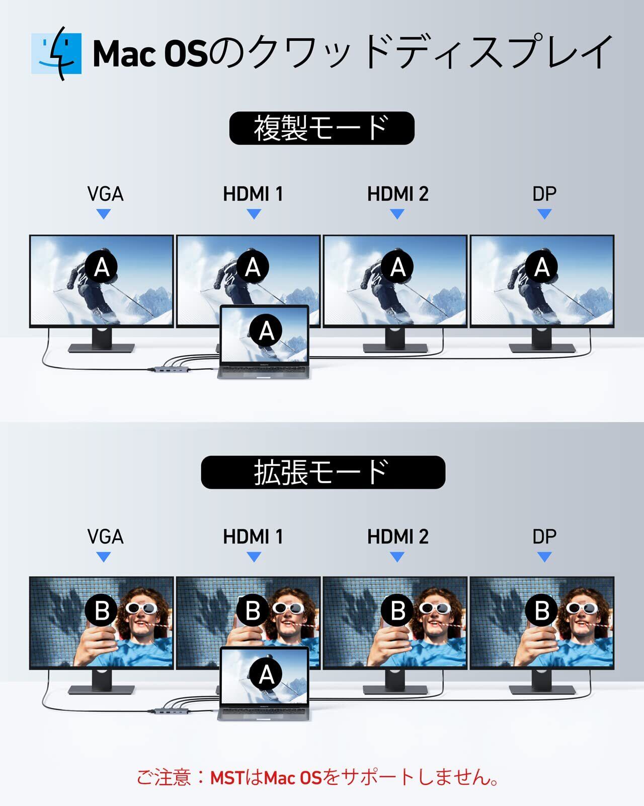 【最大5画面出力で作業効率UP 】このドッキングステーション 3画面出力はデュアルHDMI(4K@60Hz/30Hz)、DisplayPort(4K@60Hz)、VGA(1080P)を搭載し、最大4つの外部ディスプレイ拡張が可能。【ご注意】◆Intel第10世代以前のプロセッサー搭載PCの場合、ディスプレイ拡張表示は2台までとなります。◆Mac OSのシステム制限により、拡張モード時は外部モニターの数にかかわらず同一画面表示となる