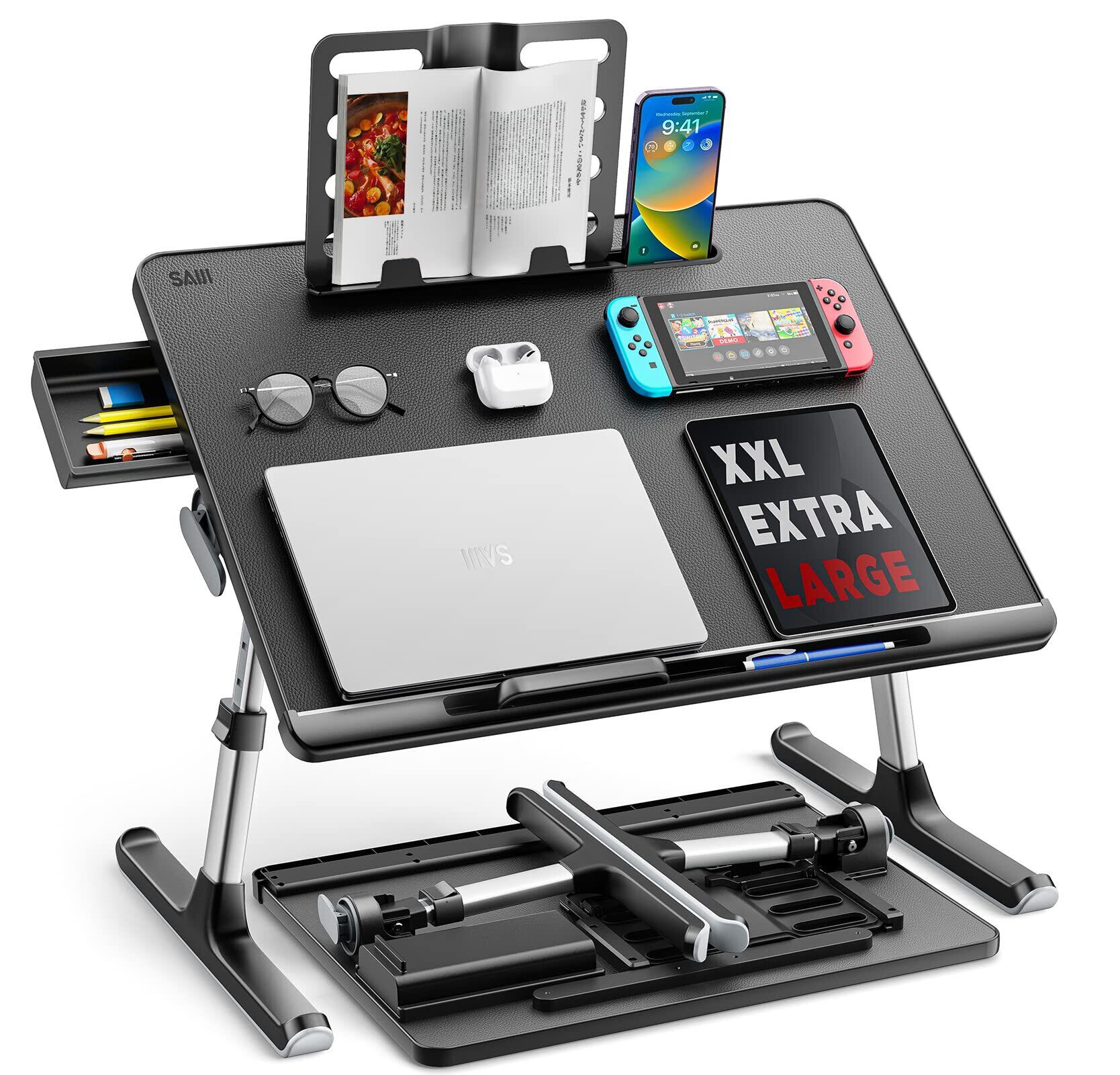 SAIJI 折りたたみ ミニテーブル「安定性強化版」机 ローテーブル ベッドテーブル ノートPCパソコン ちゃぶ台 大容量天板 角度 高さ調整 引き出し ブックスタンド付き 表面PVC加工 40kg荷重 軽量 勉強 食事 一人暮らし K7 (ブラック,60*45cm)