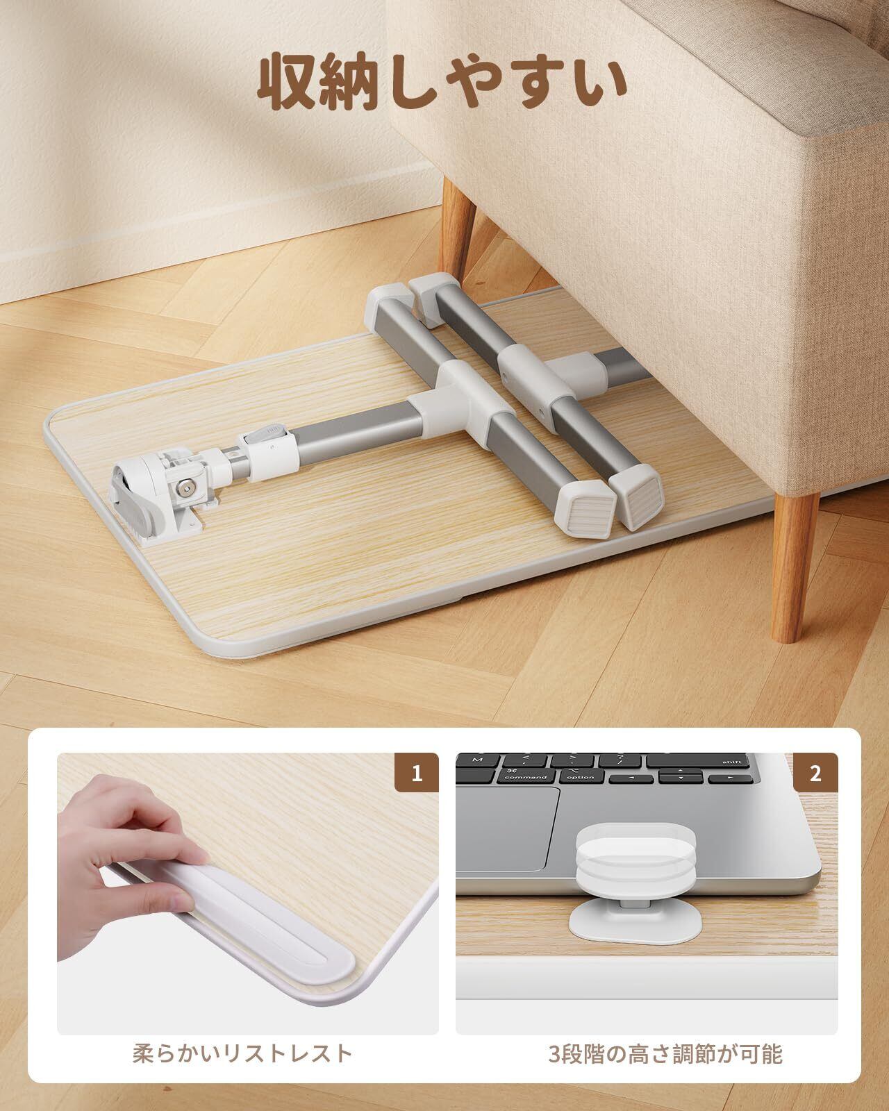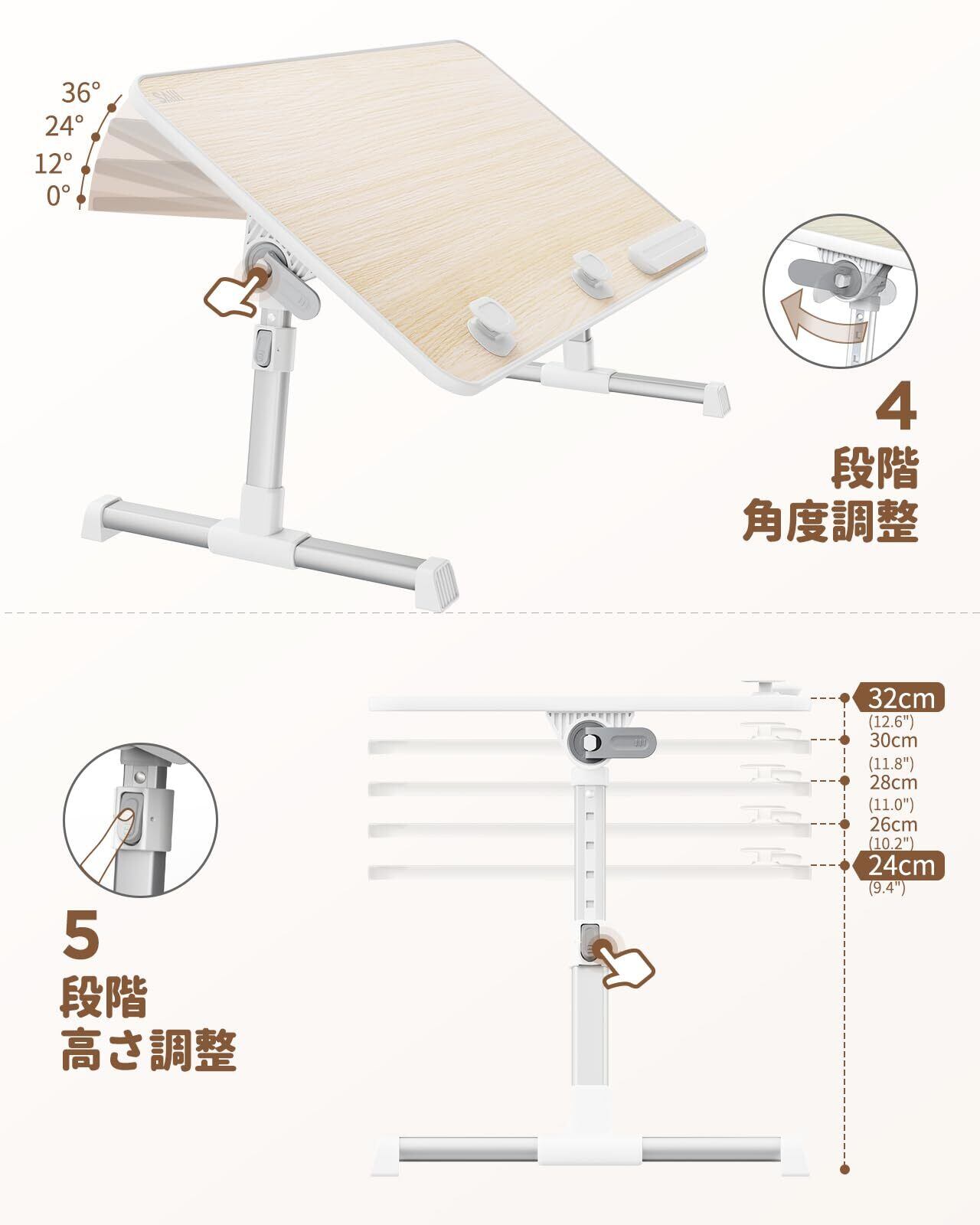 角度·高さを調節できるテーブル:高さ:5段階調整:24~32cm、角度は4段階:0~36°調整できる;天板の下広い空間がある両脚が自由に動けます。休日にノートpcで映画を見ながらベッドで過ごす時間を快適に。