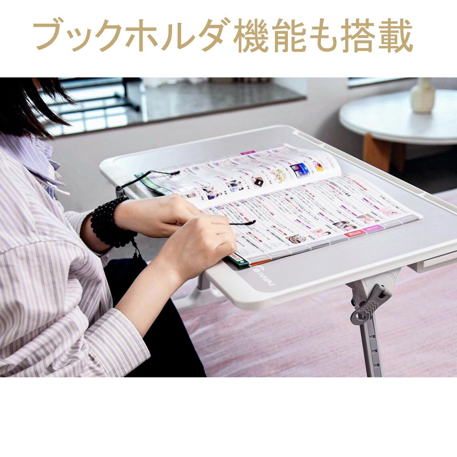 【商品特徴】 他製品との違いは以下の2点です:1. スムーズな角度調節:天板を0~360°の間で無段階に調整可能。2. ブックホルダー(本止め)機能を搭載しており、天板を傾けても、上にある各種サイズの本や書類がしっかり固定でき、読書や作業が快適。