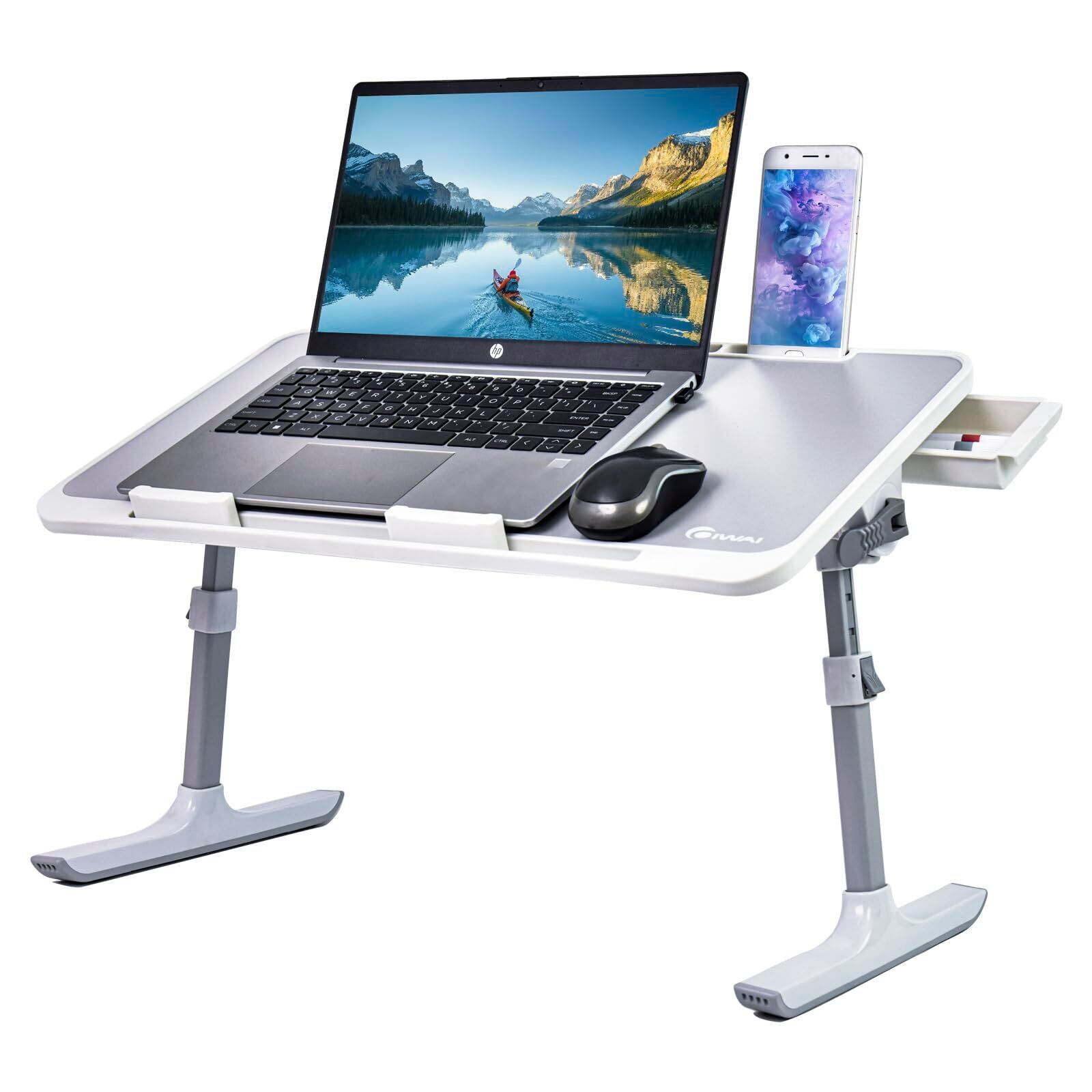 ベッドテーブル ノートパソコンデスク ベッドデスク 書見台機能あり タブレット、スマホンホルダー機能付き 昇降式 折りたたみ ローテーブル 軽量 高さ調節 角度調節 引き出し付き