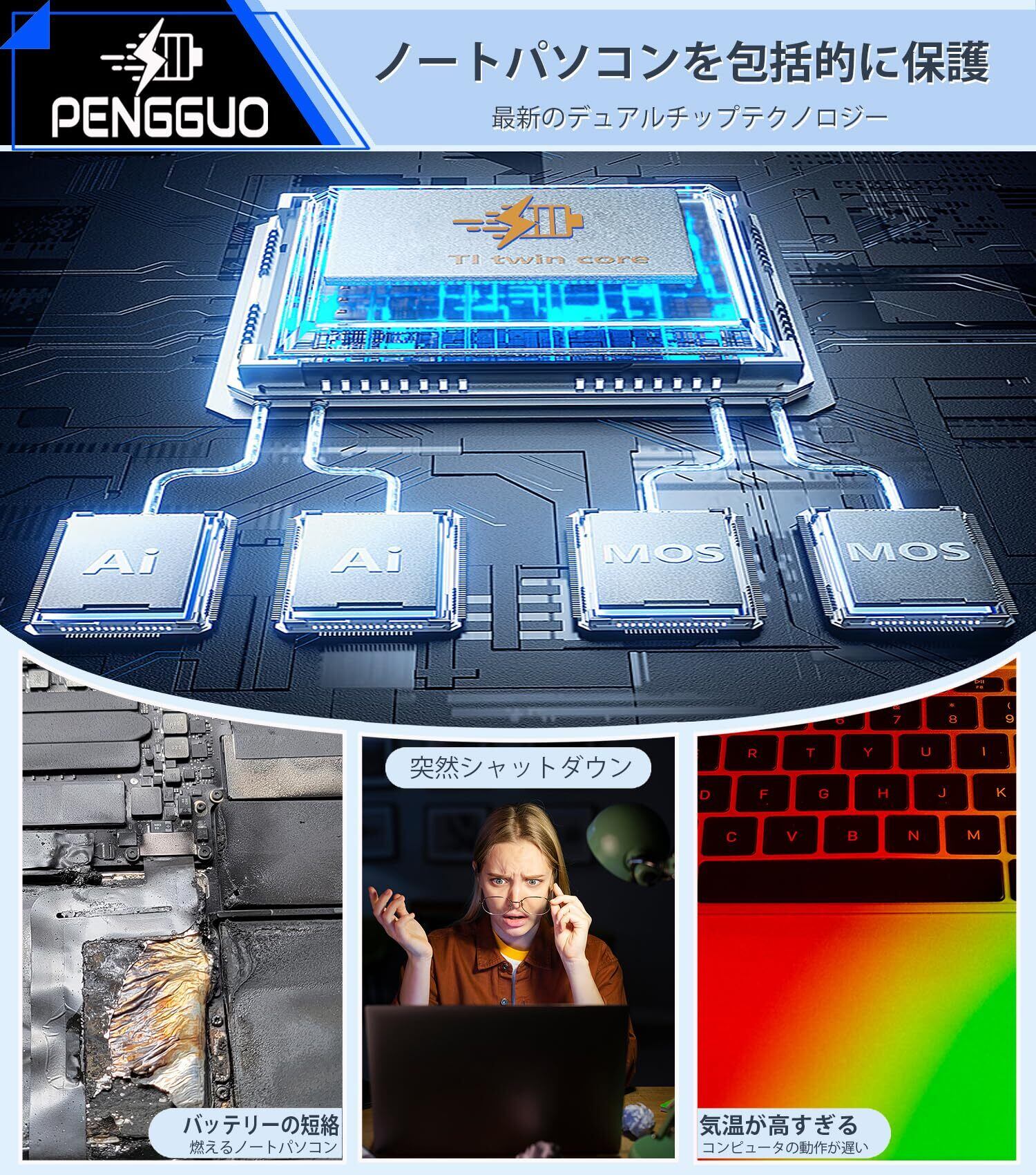 【電池優勢】1. 電池寿命が1500+次充電サイクルを超え. 2. 100%安全性をし. チップのアップグレード:インテリジェント温度制御、過熱保護、過充電保護、短絡保護などの6つの保護を提供します。(バッテリ膨張を改善)バッテリがノートパソコンを破損させることはありません、3. フル充電後のコンピュータの長時間の稼働時間を確保するための高性能コア、真の容量
