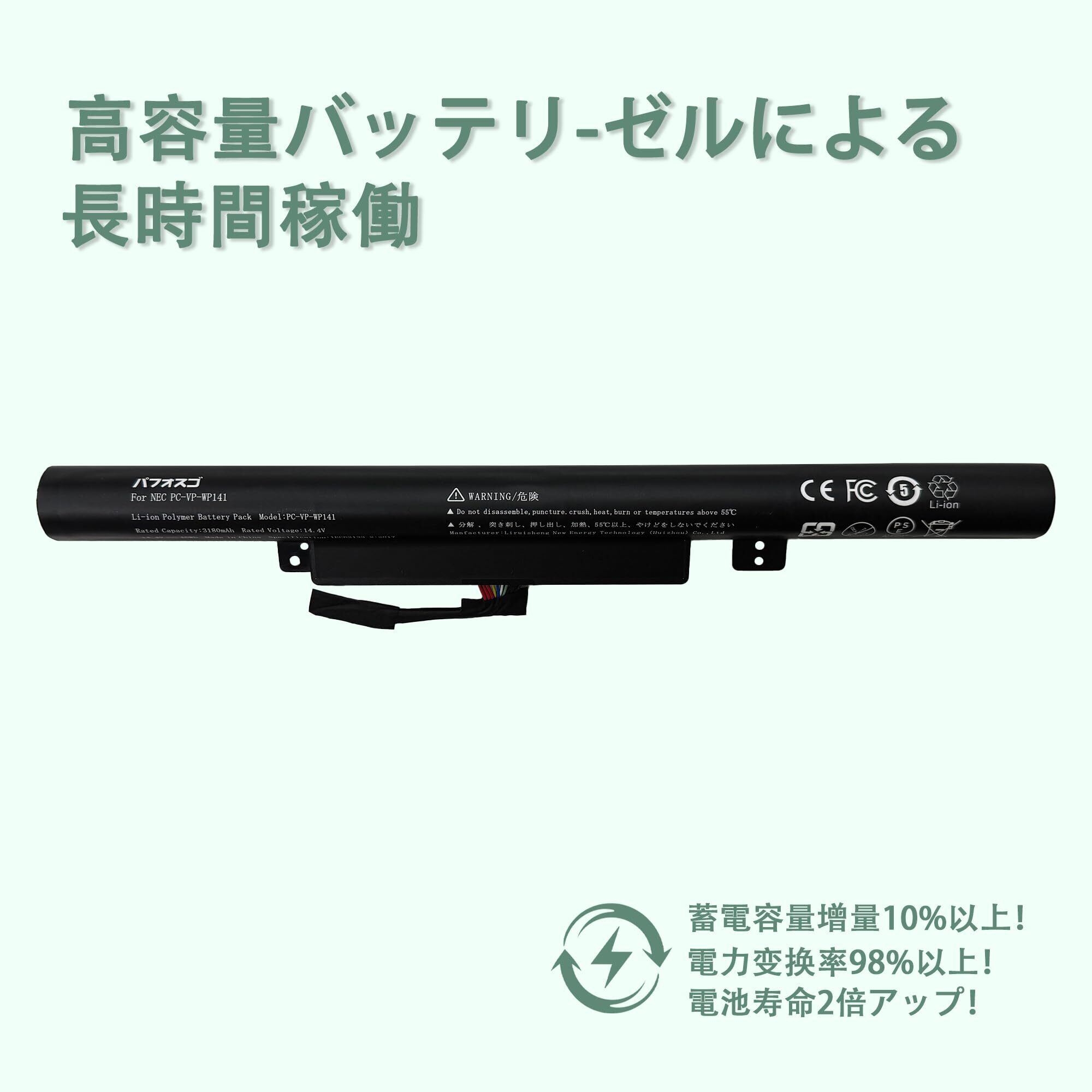 【PSE、CE、UL証明書】当社のNEC PC-VP-WP141batteryはPSE、CE、UL認証を取得しています。コバルト酸リチウム、グラフェン、有機電解質などの先端材料を使用し、安全性、信頼性、環境性、耐久性、放熱ブロック、極めて膨張しにくいなど、日本・欧州・米国で義務づけられている安全性試験をクリアし、安心して購入できるバッテリーです、対応NEC PC-VP-WP141 battery。