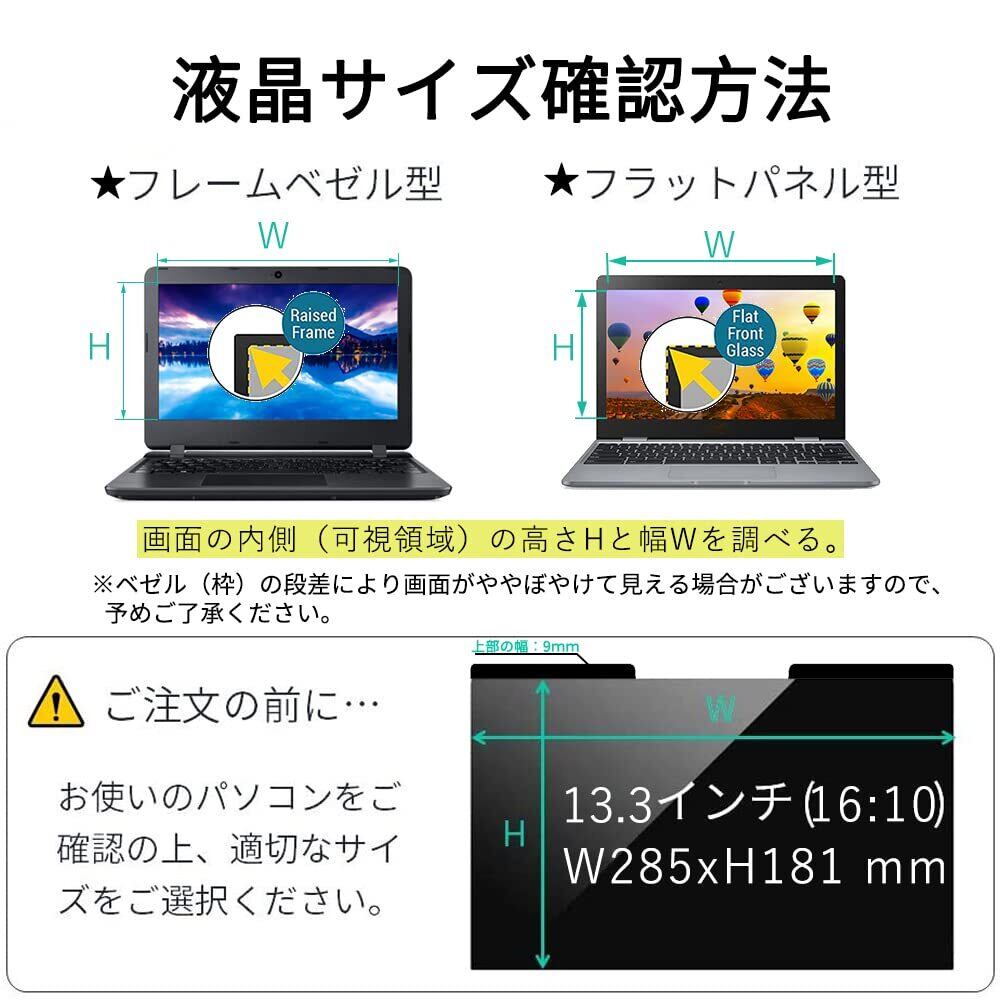 ■【プライバシー保護】視野角 60度、正面から見れると画面はクリアでも、隣の席からは真っ暗に映る偏光性を有する「覗き見防止フィルター」です。【対応機種】13.3インチ 縦横比16:10 寸法:フィルター部分のみ 285×181mm(縦幅/横幅のばらつき:+/-1mm程度)。上部の黒いマグネット部分は約9mm。画面とベゼルの高低差により画面がややぼやけて見える場合が御座います。