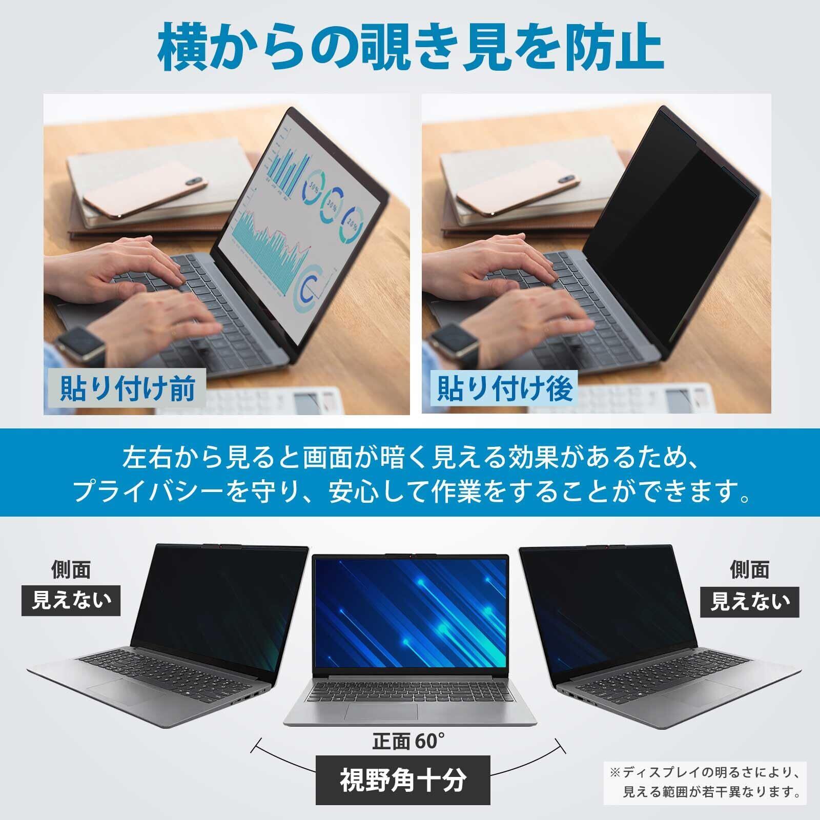 プライバシー保護:正面からの視認性を保ちつつ、側面からの覗き見を防ぐことができます。約60度の視野角(左右30度)を越えると画面が暗く表示されるため、情報漏えいを防止する覗き見防止フィルターです。スクリーンフィルター、目隠しシート、セキュリティフィルムとして仕事・学習・移動時に最適です。対応サイズ:14インチ 縦横比 16:9 フィルター部分のみの寸法:310mm x 177.5mm (縦幅/横幅のばらつき:+/-1mm程度)
