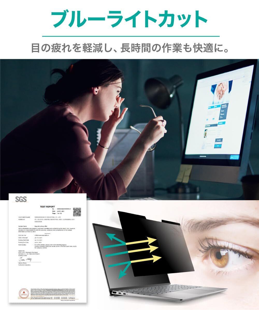 [ ブルーライト半減 ] 私たちが子供の頃にはなかったノートパソコンのスクリーンから発せられる青色光。 毒性の強いブルーライトは眼精疲労や体内リズムへの影響が益々懸念されています。 本製品は覗見防止効果を有しながら、ブルーライトを約50%低減。将来のことを考えるならブルーライトカット対応フィルムがオススメです。AG面は反射率5.8%とアンチグレアで光の映り込みもほとんどありません。