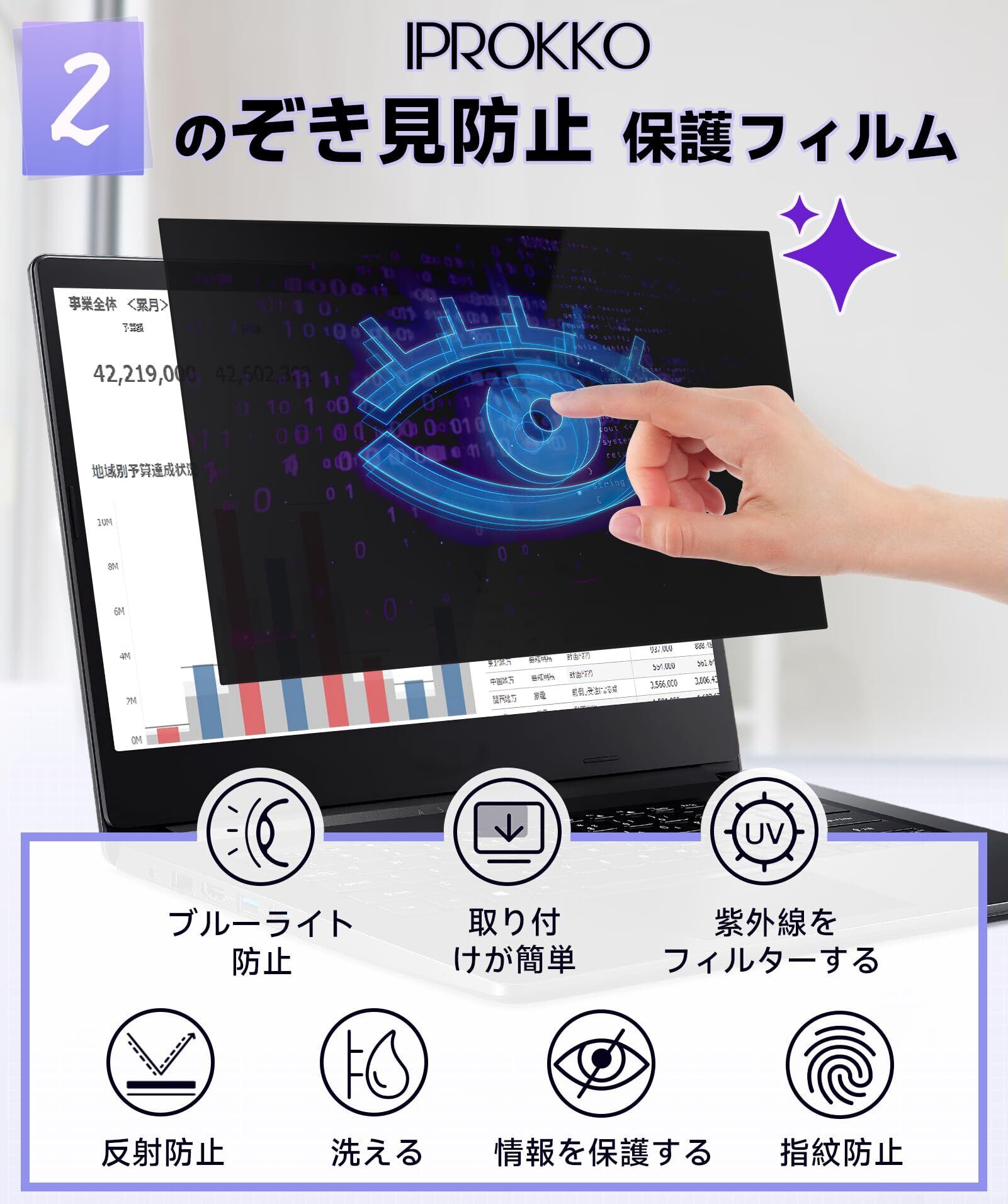IPROKKO 14インチ (16:10) パソコン 覗き見防止フィルター 液晶保護フィルム ブルーライトカット 反射防止 取り外し可能フィルム Lenovo/Dell/HP/東芝/富士通/Asus などに対応