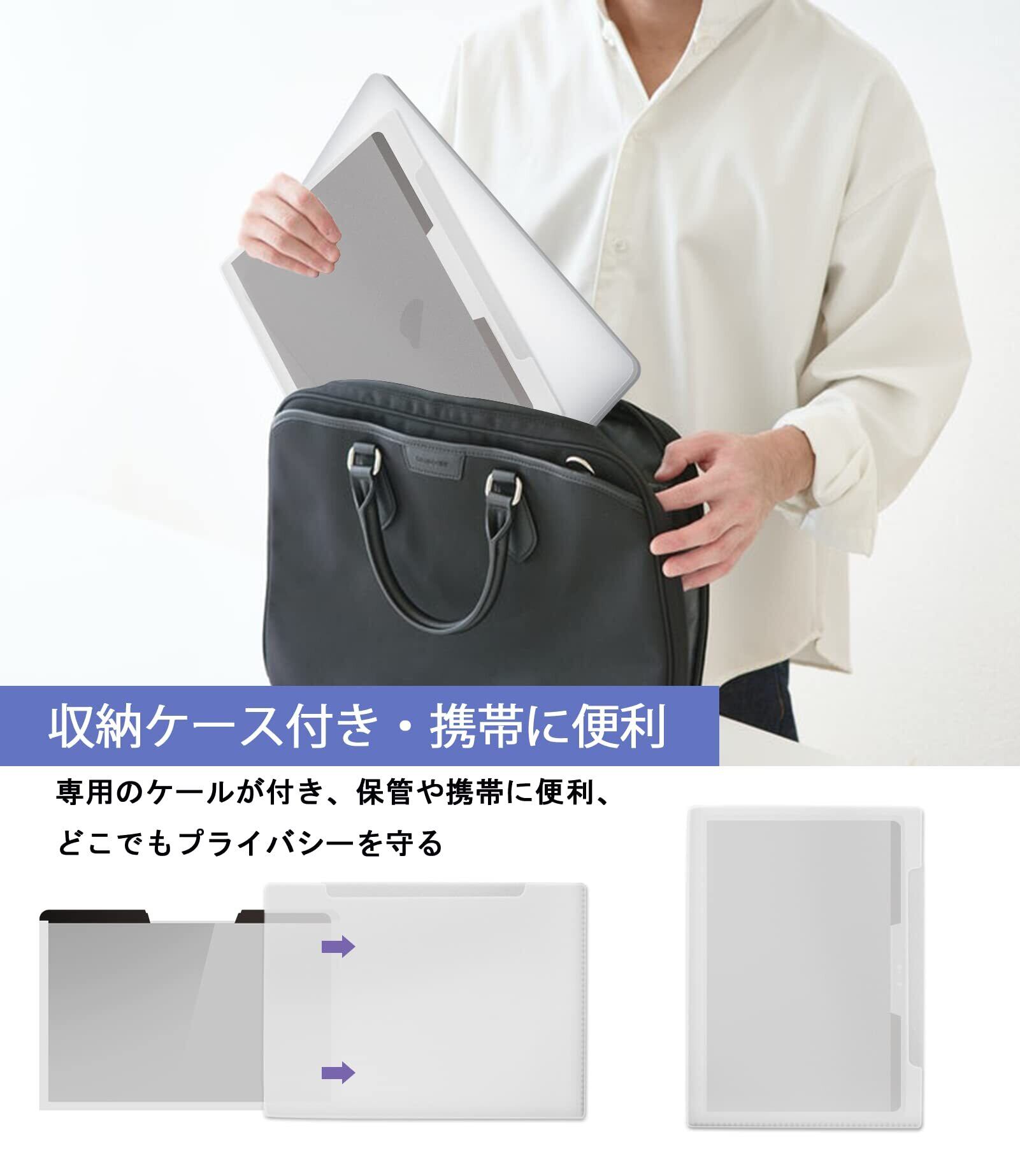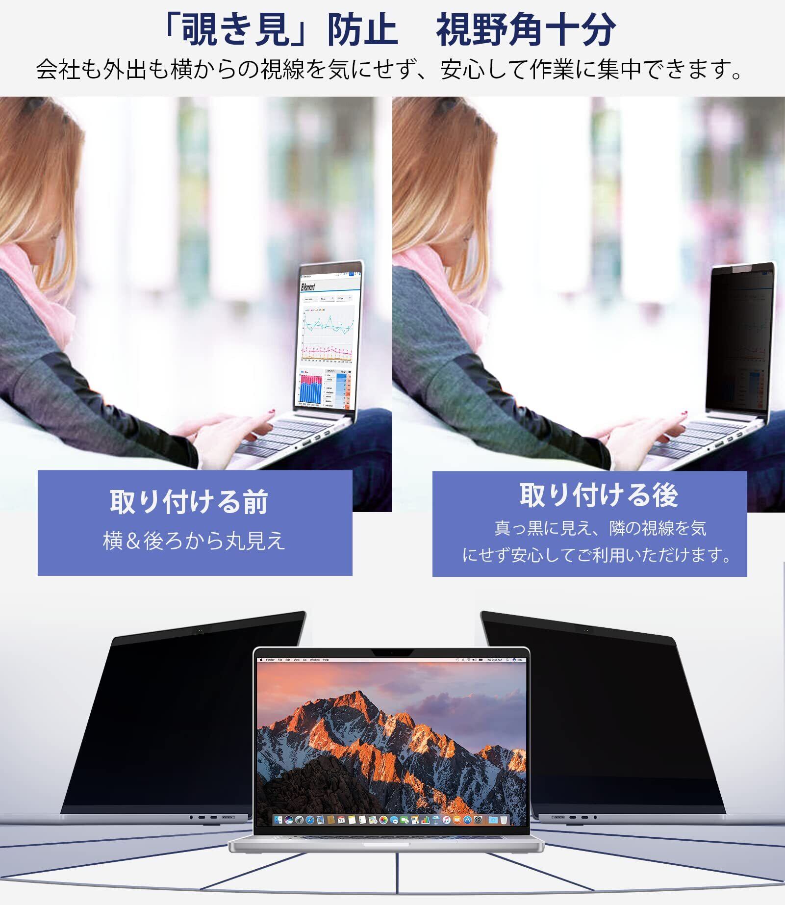 【プライバシー保護・セキュリティ対策】視野角60度、正面から見れると画面はクリアでも、隣の席から画面に何が表示されているのか見えないようにする偏光性を有する「のぞき見防止フィルター」です。第三者との共用スペースで作業する際は、プライバシーを守るため覗き見防止フィルターの使用も推奨している。